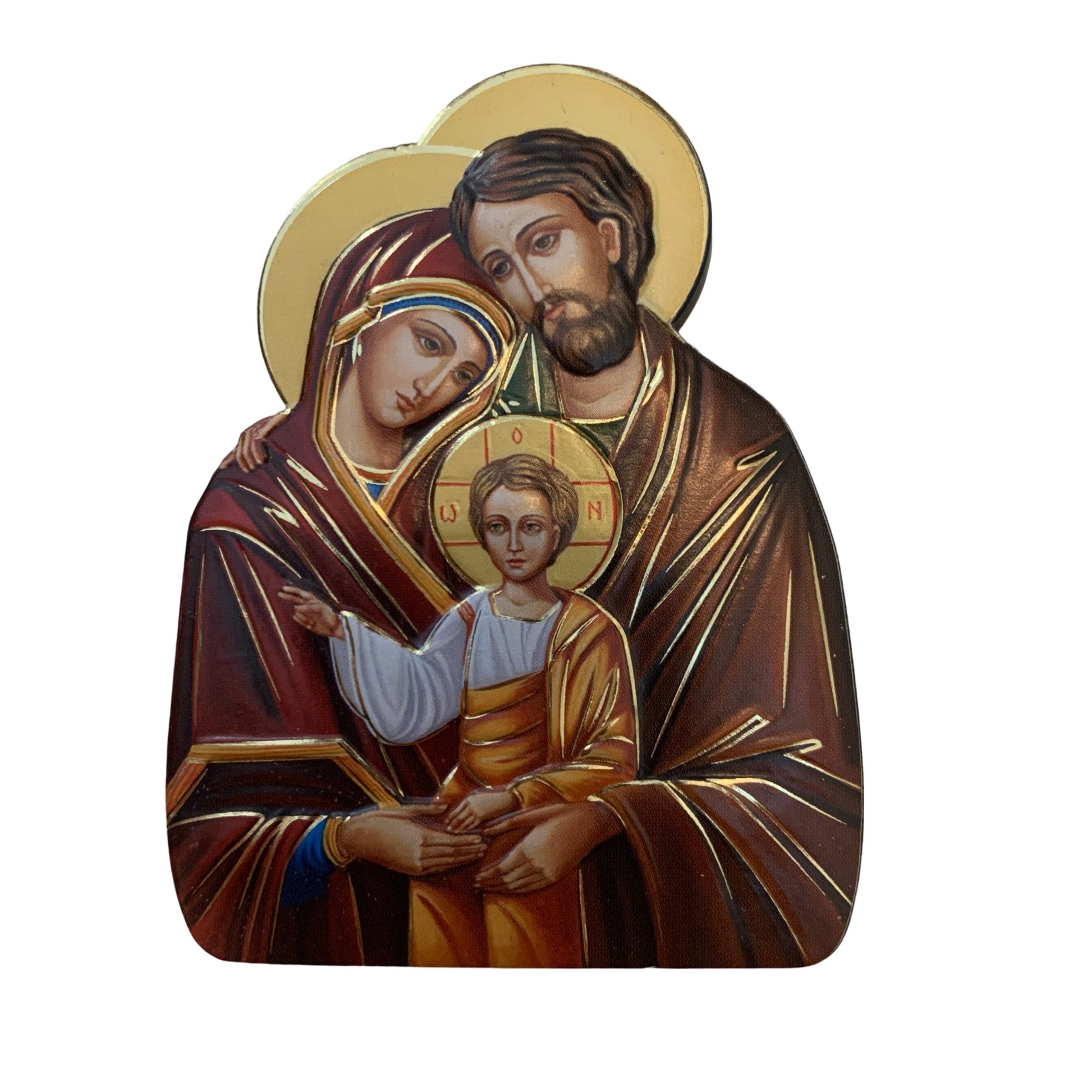 This wooden Holy Family icon with gold details can beautifully stand in your home or on your desk! May this icon be a constant reminder of the Love of the Holy Family as the Child Jesus is pictured blessing all those who keep this image near them.