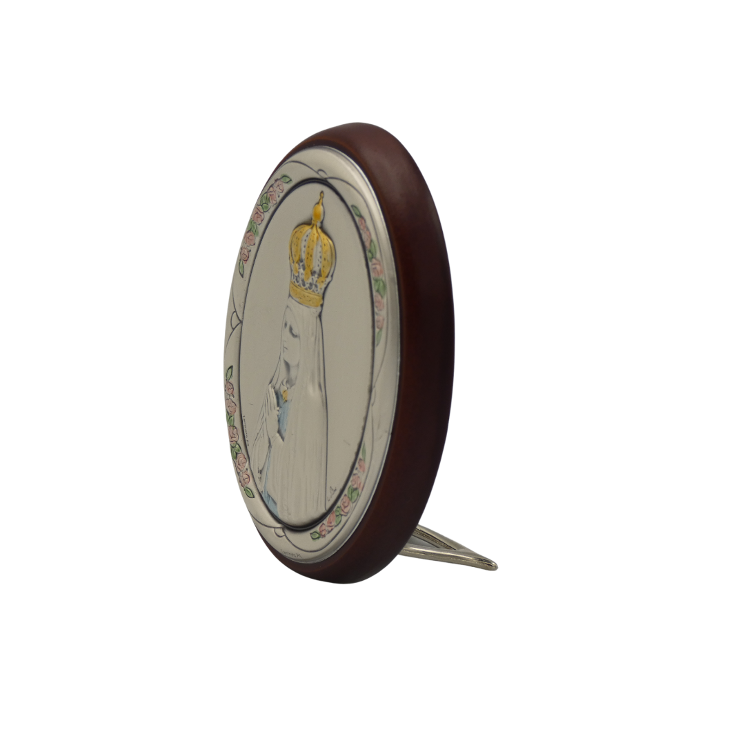 A colored silver image of Our Lady of Fatima is an elegant addition to any home or office, bringing a beautifully Marian presence to any space. This image is accompanied by a removable metal footing to be stood on tables and bookshelves, as well as mounted on walls. This product is brought with love by our Sisters serving the Heart of the Church in Rome, Italy!