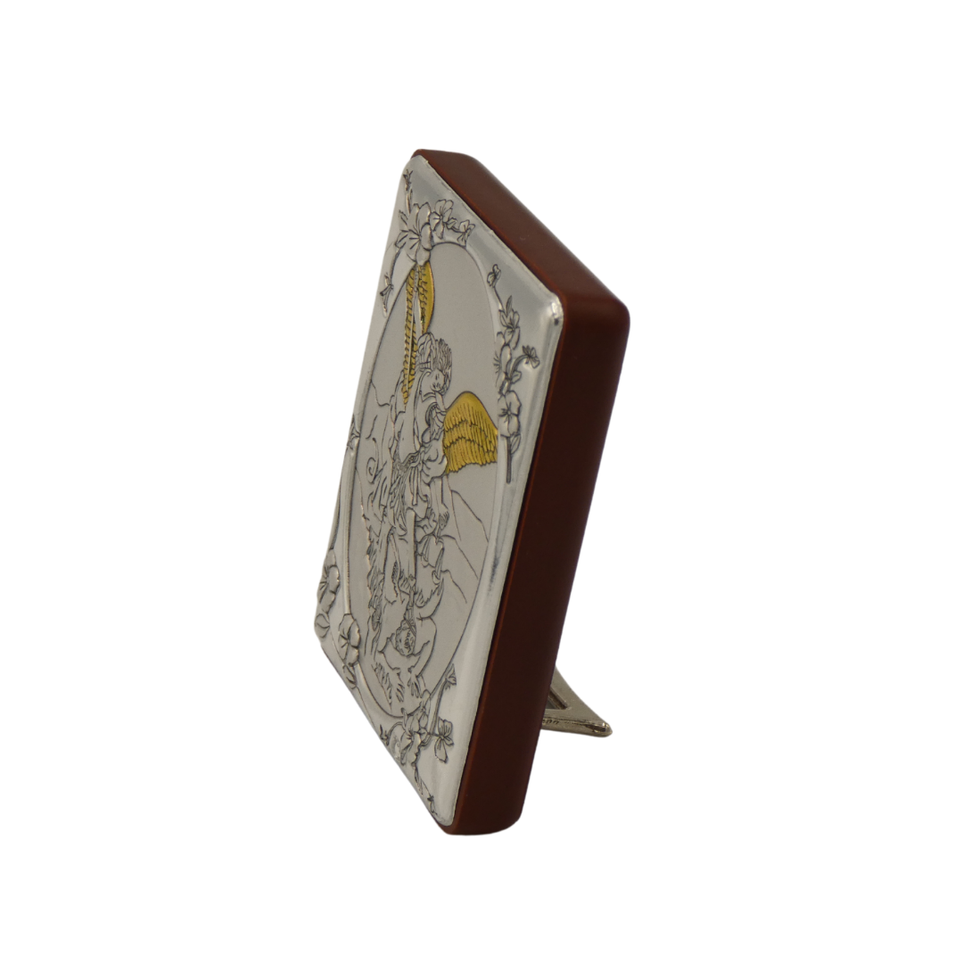 A square colored silver image of St. Michael is an elegant addition to any home and a constant assurance of his spiritual protection. This image is accompanied by a removable metal footing to be stood on tables and bookshelves. This product is brought with love by our Sisters serving the Heart of the Church in Rome, Italy!