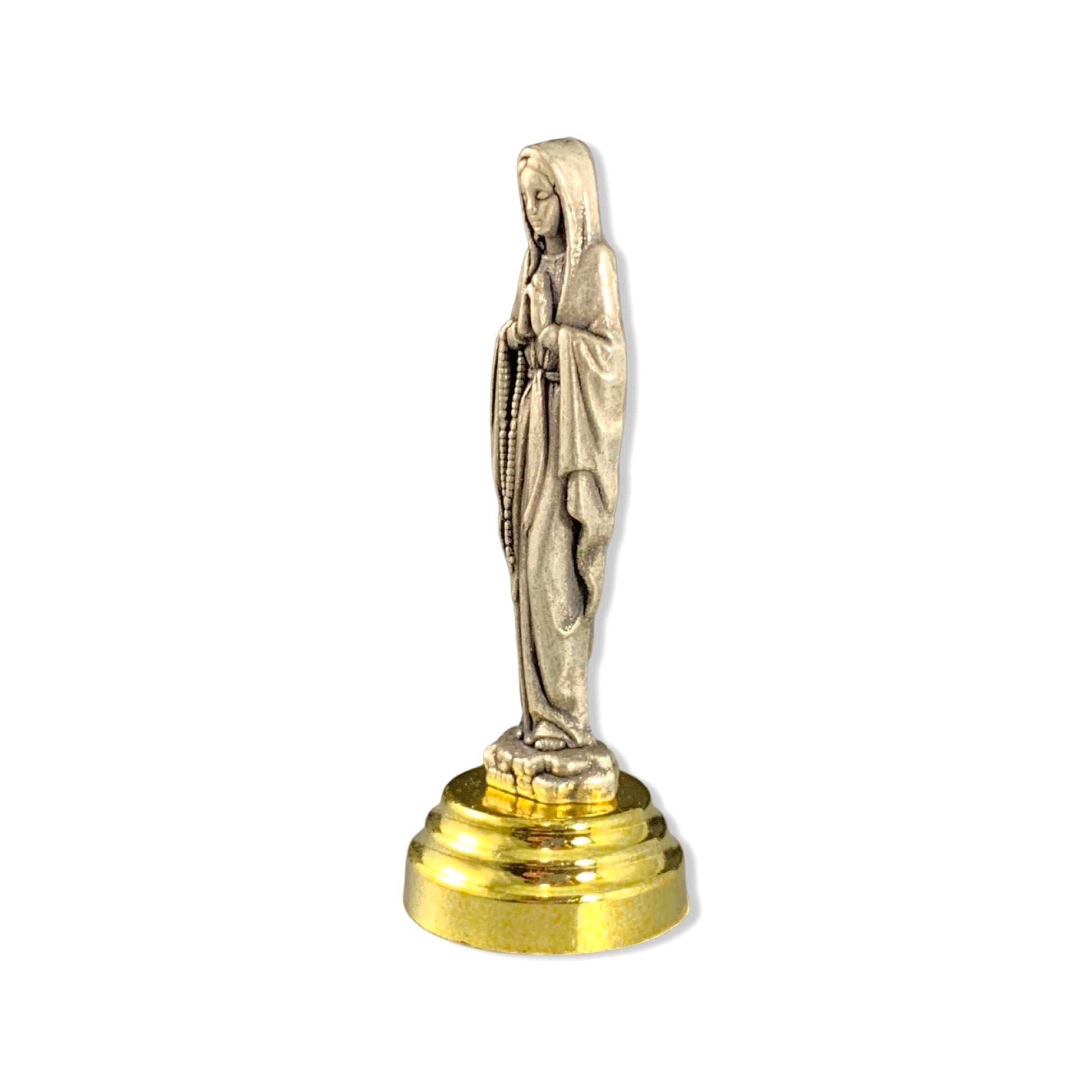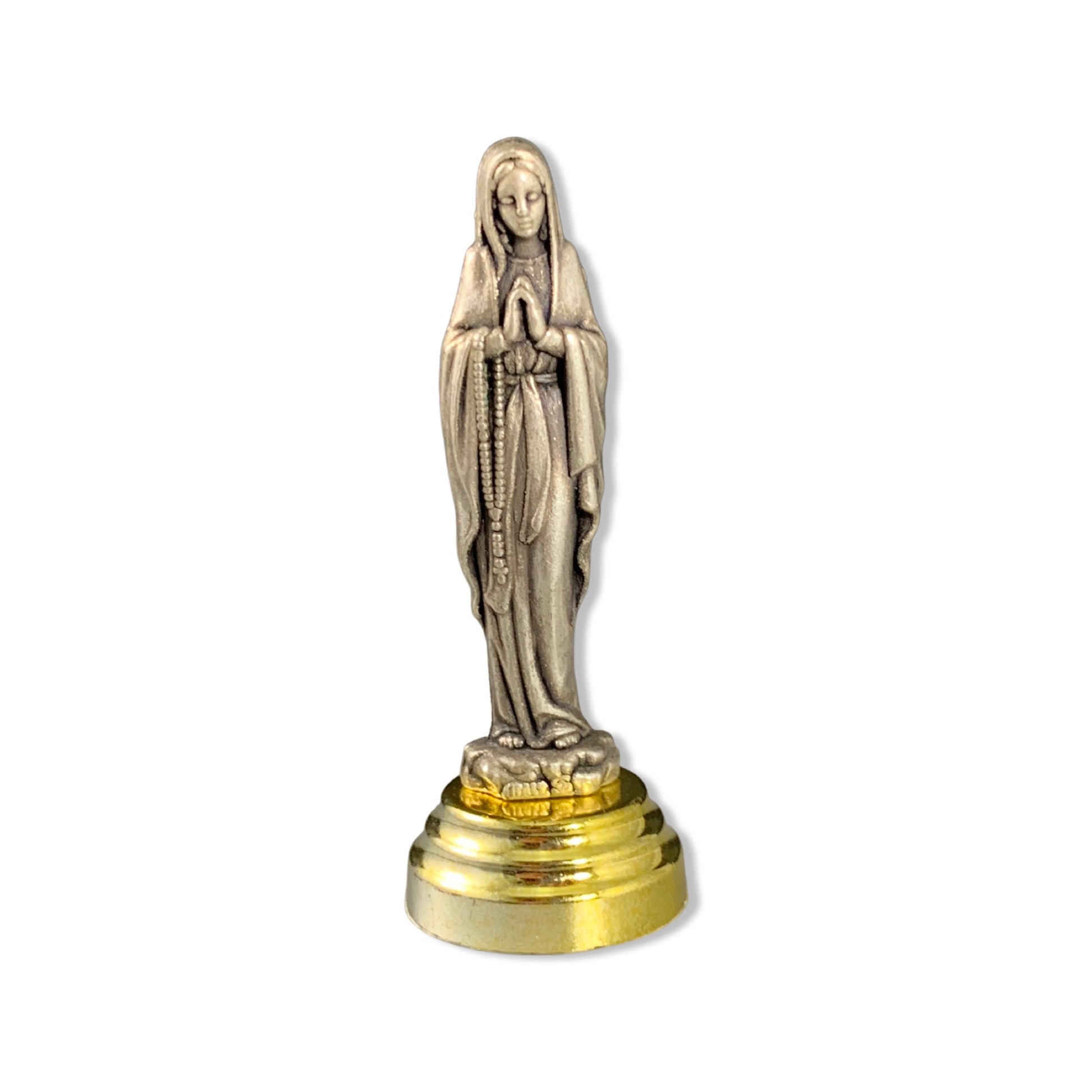 A small metal statute of Our Lady of Lourdes is a perfect to be kept in a purse or placed on desks and night tables. The base of this statue is equipped with an adhesive foam to be stood on car dashboards and more! Our Lady of Lourdes is a powerful intercessor and maternal presence especially for the sick. This product is brought with love by our Sisters serving the Heart of the Church in Rome, Italy!