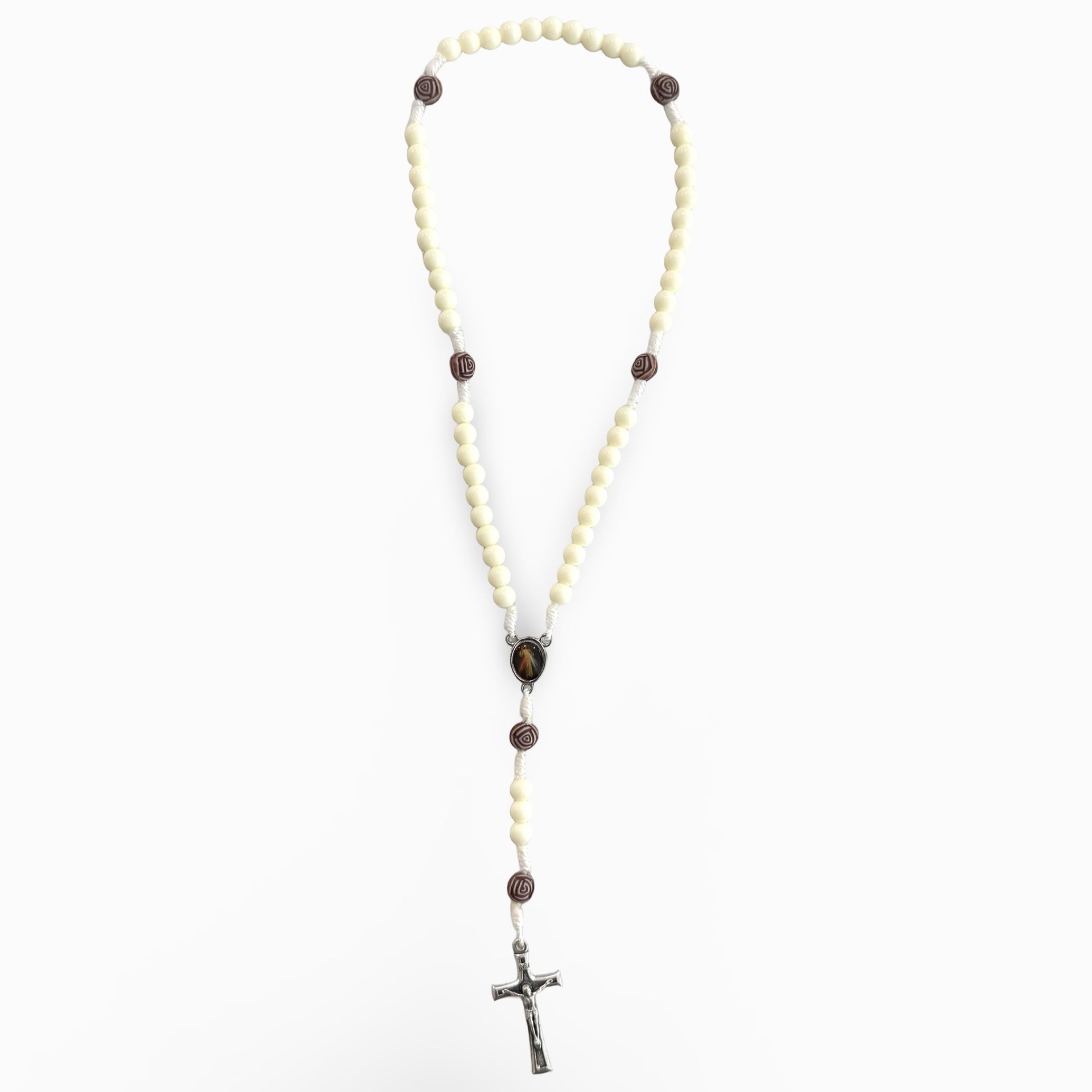 This product is a simple but elegant white rosary with small rose beaded accents. Perfect to pray with in a chapel or on the go!