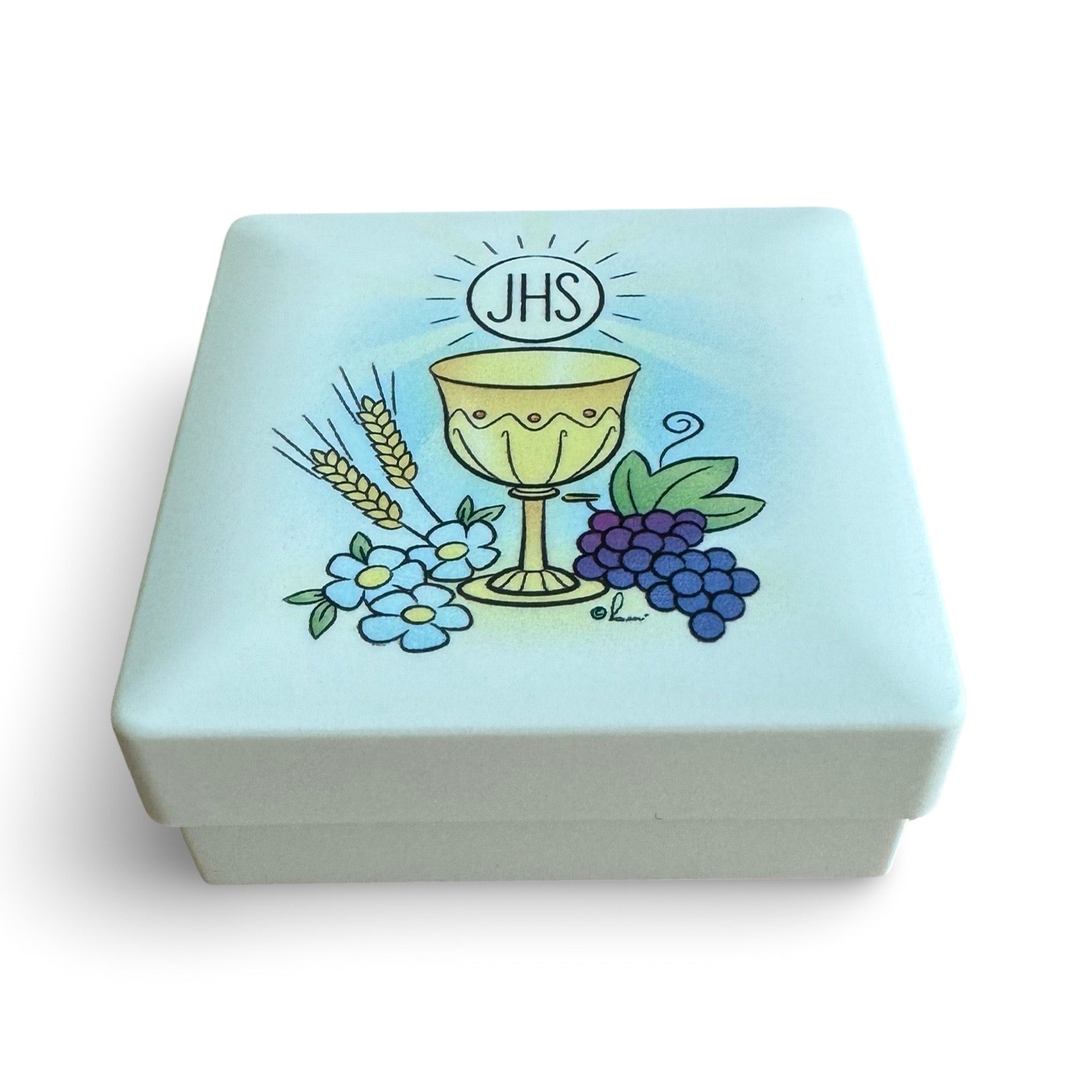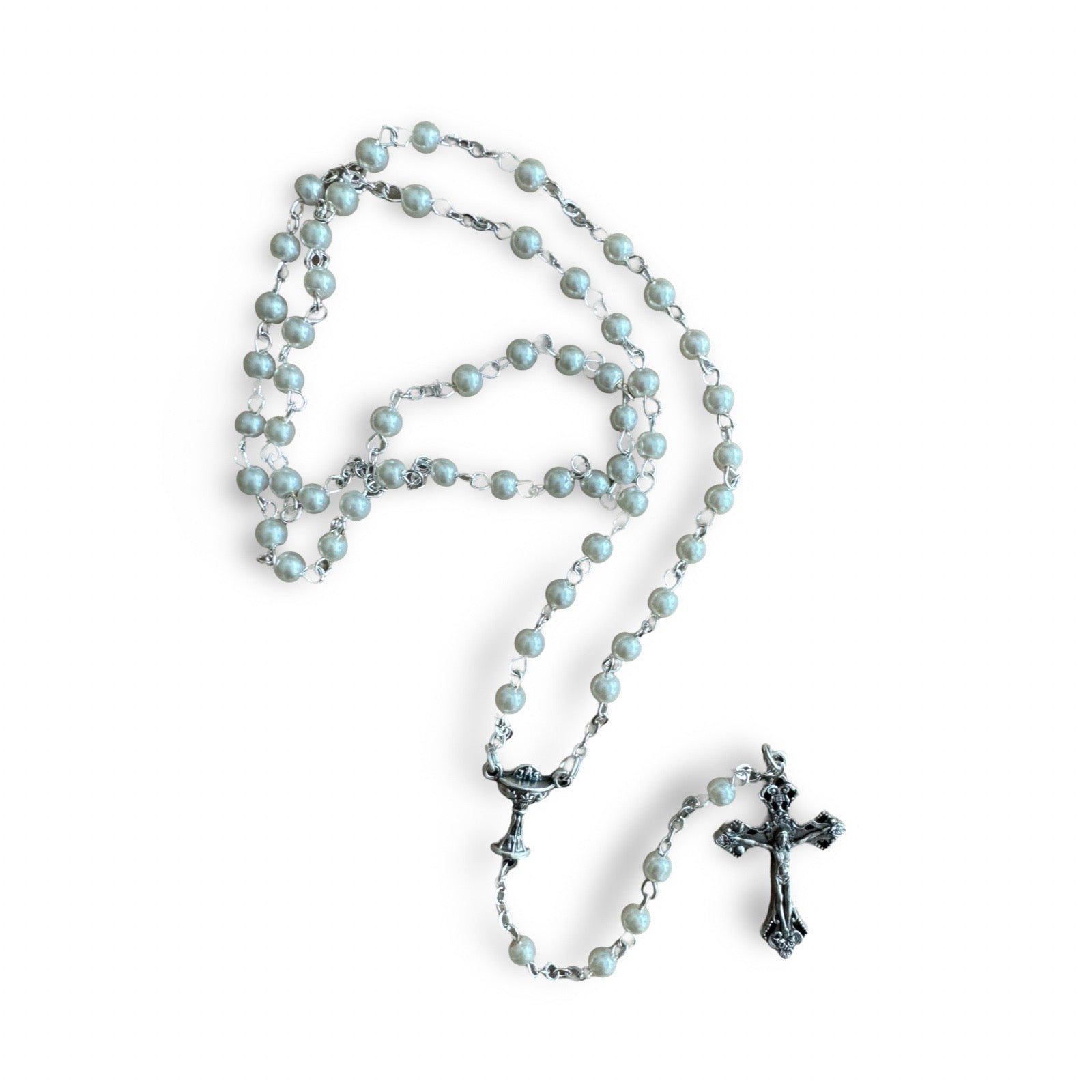 This delicate pearl first Communion rosary comes in white with a colored image of the Consecrated Host and Chalice. It will make a perfect present for a first communion gift.