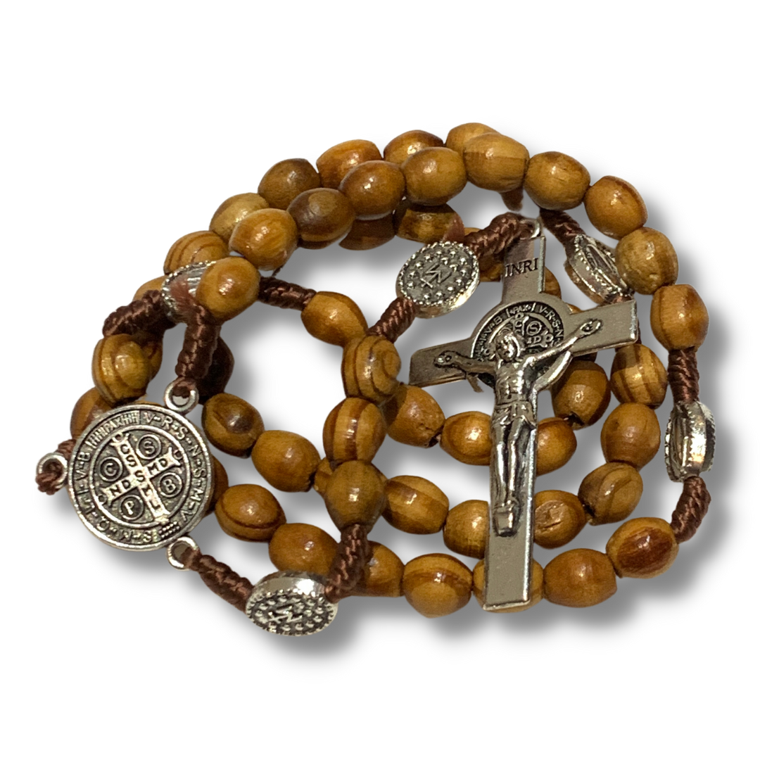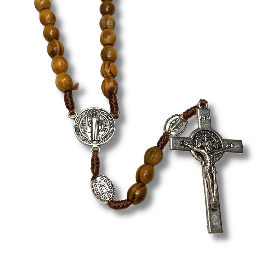 A genuine olive wood rosary with Miraculous Medals as the Our Father beads and a Saint Benedict medal as the center bead. This rosary also boasts an olive wood cross with a medal St. Benedict crucifix. This rosary comes all the way from the Holy Land and is brought by Mother Adela, Foundress SCTJM, when she leads pilgrimages. Uniting St. Benedict with the heart of Our Lady, the prayers offered from this rosary bring many graces for those praying and being prayer for. This rosary, coming from the land where Our Lord lived and died, is perfect as a gift or for yourself to offer prayers for your family, your friends, and the entire world.