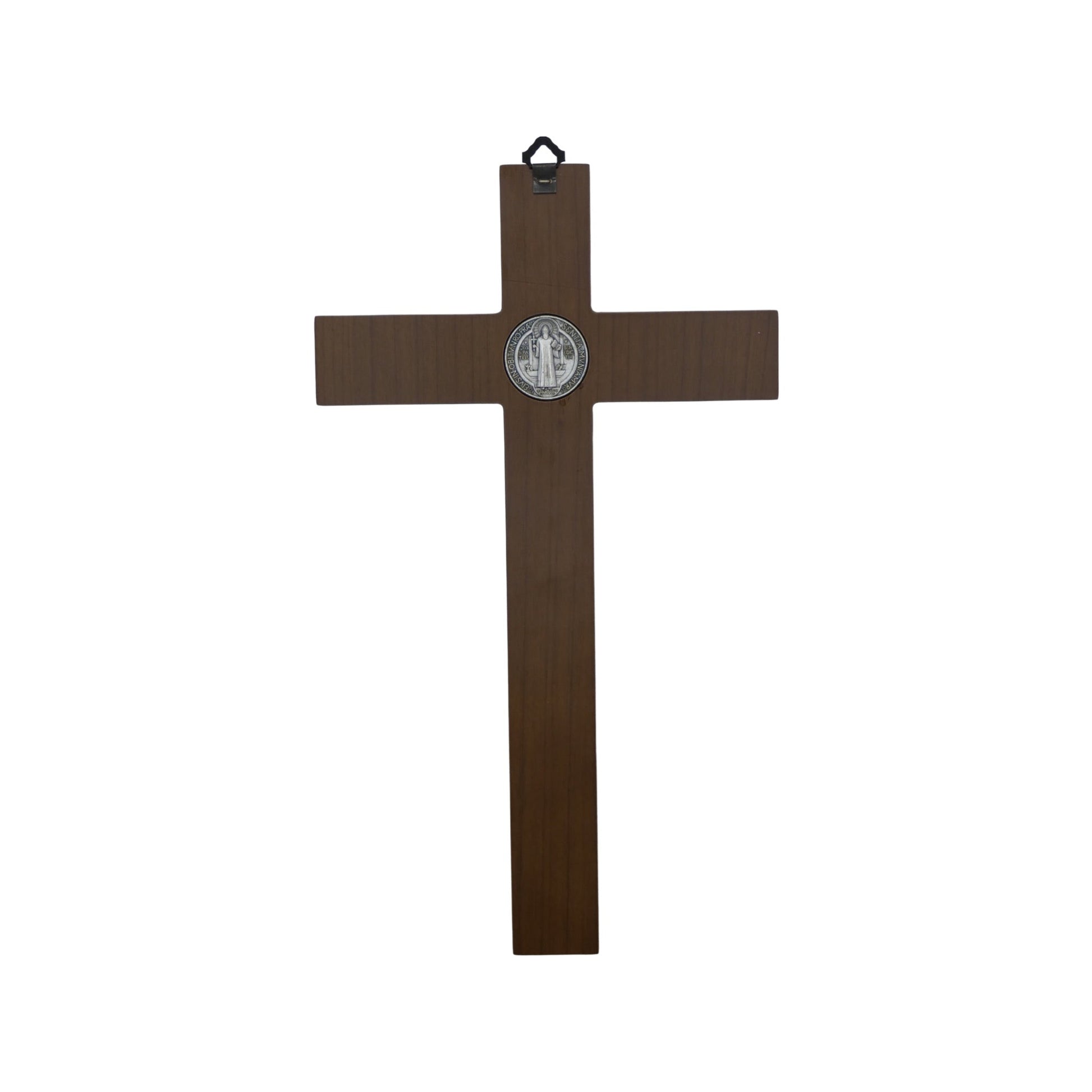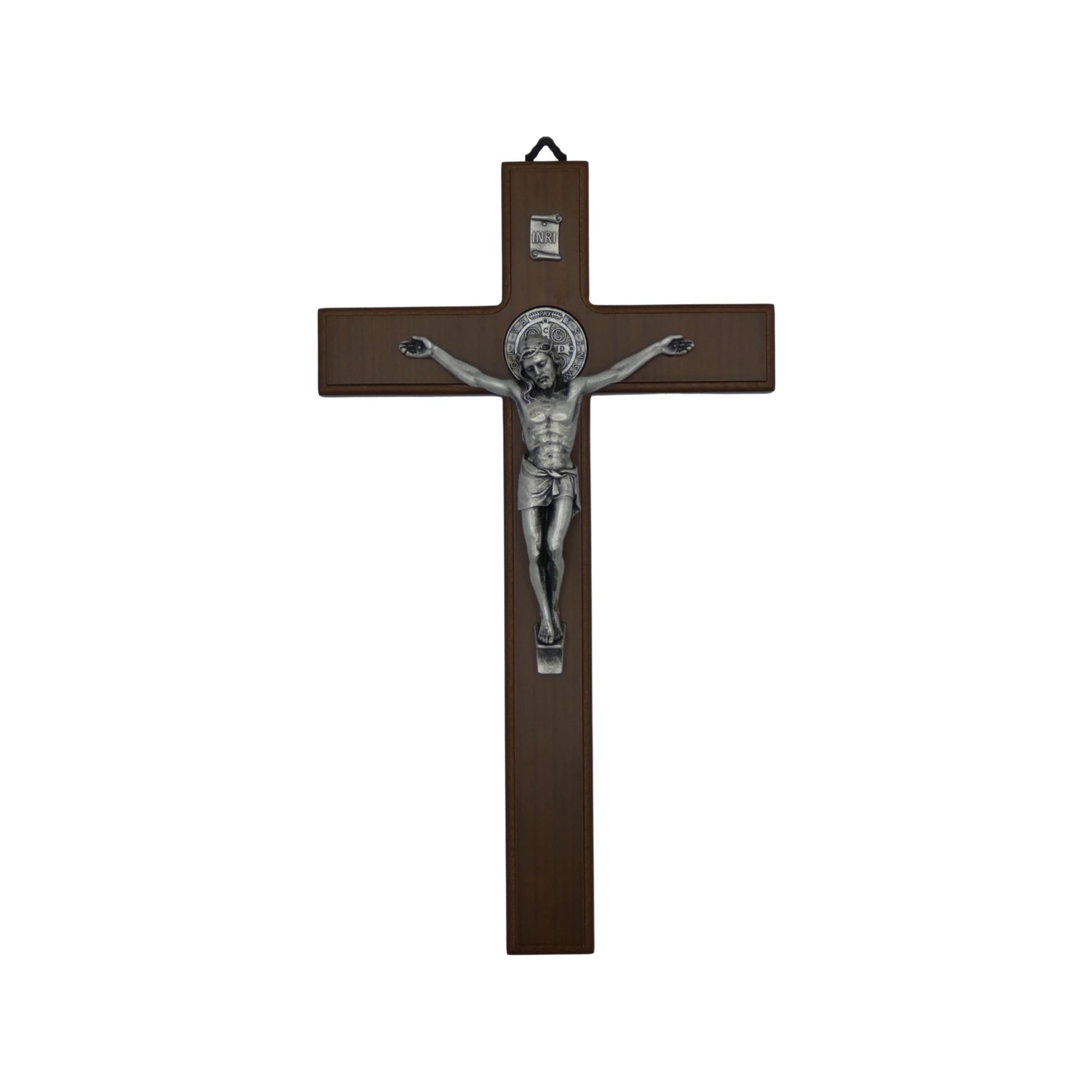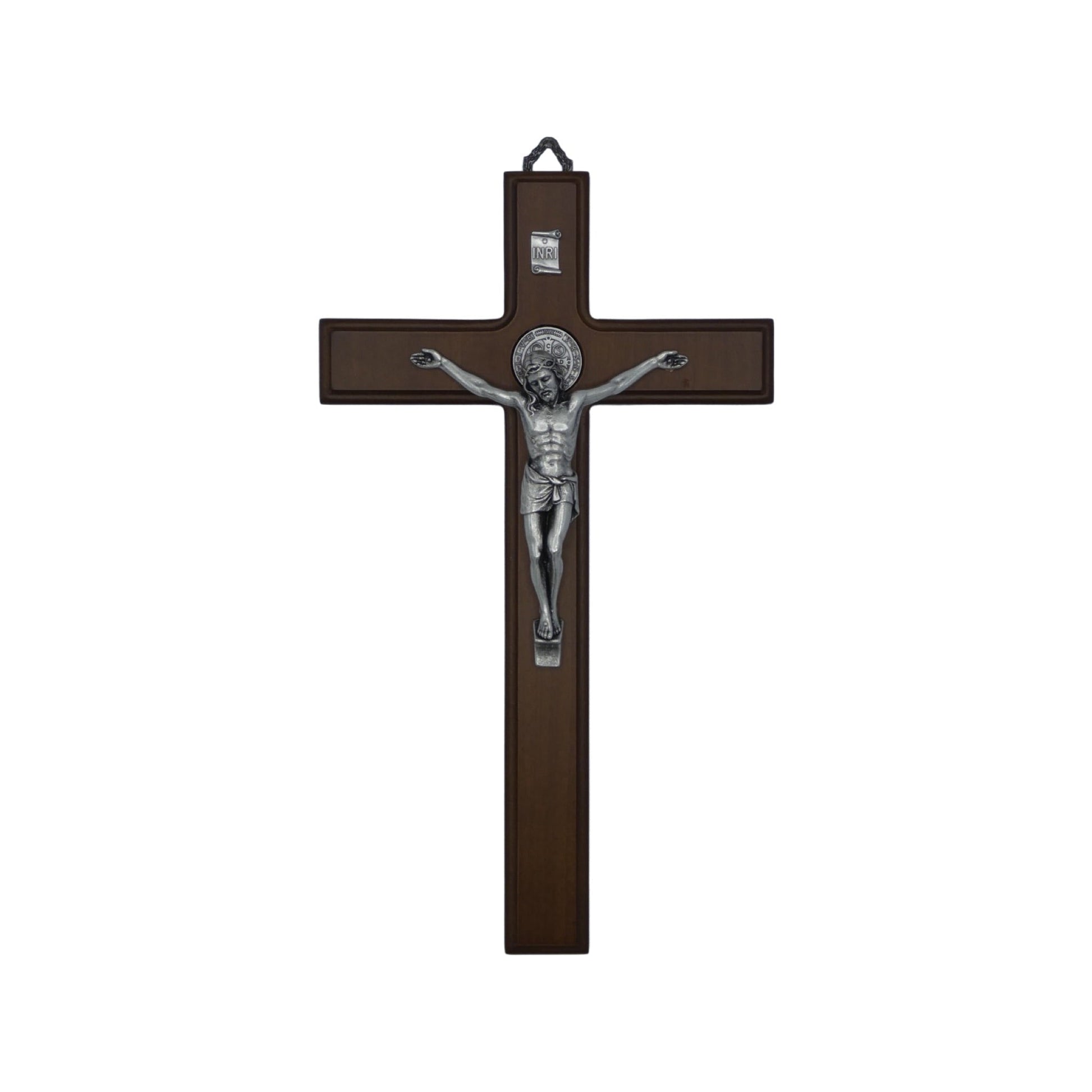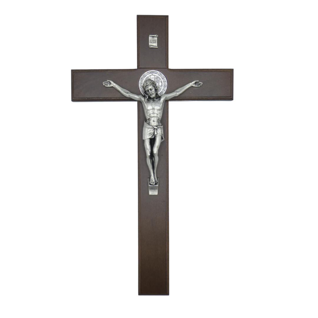 A traditional walnut stained wood cross and a silver corpus. A silver St. Benedict medal is set where the crossbeams meet. A powerful sacramental of the Church, the St. Benedict crucifix, when exorcized and blessed, brings a particular protection of the home where it is placed against evil as well as a particular presence of Christ himself. Available in 3 sizes, this crucifix can find a home in any room or office, protecting the room or office and those who use it and evangelizing those who visit. These crucifixes are purchased for our shop by our sisters who live and serve in the Heart of the Church in Rome.