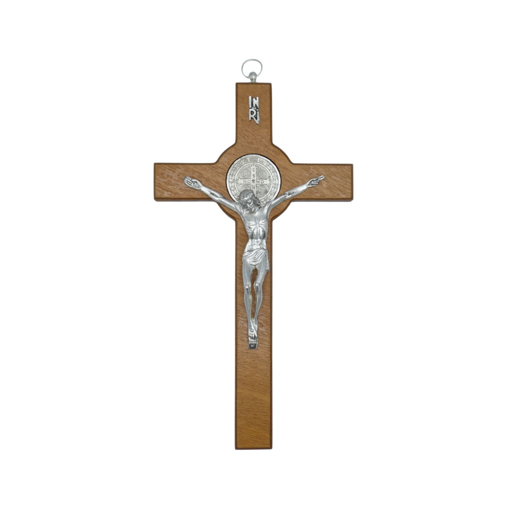 A traditional cherry stained wood cross upon which hangs a silver corpus. A large silver St. Benedict medal is set where the crossbeams meet. A powerful sacramental of the Church, the St. Benedict crucifix, when exorcized and blessed, brings a particular protection of the home where it is placed against evil as well as a particular presence of Christ himself. Available in two sizes, this crucifix is a great statement hung at the entrance of a house or any medium to large room, claiming it and those who live there for Christ. These crucifixes come from the Villa of Our Lady of Guadalupe in Mexico and brought to our shop with love by members of the Family of the Pierced Hearts.