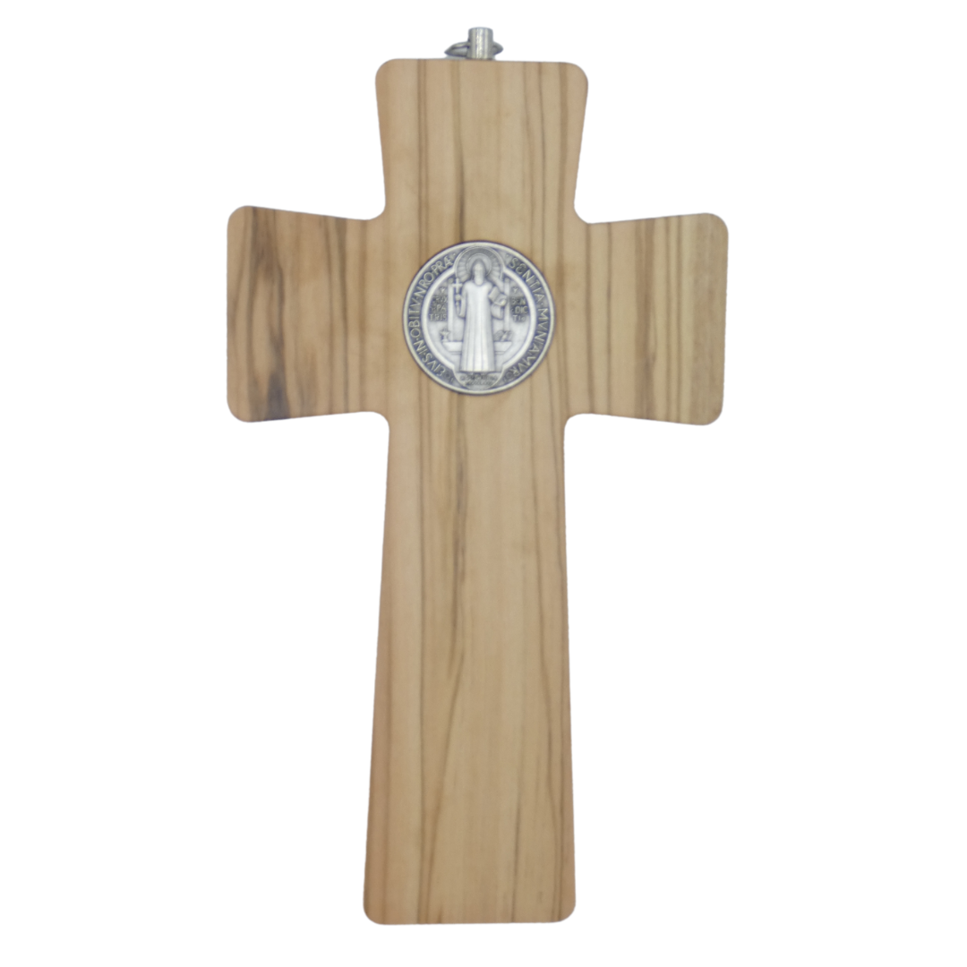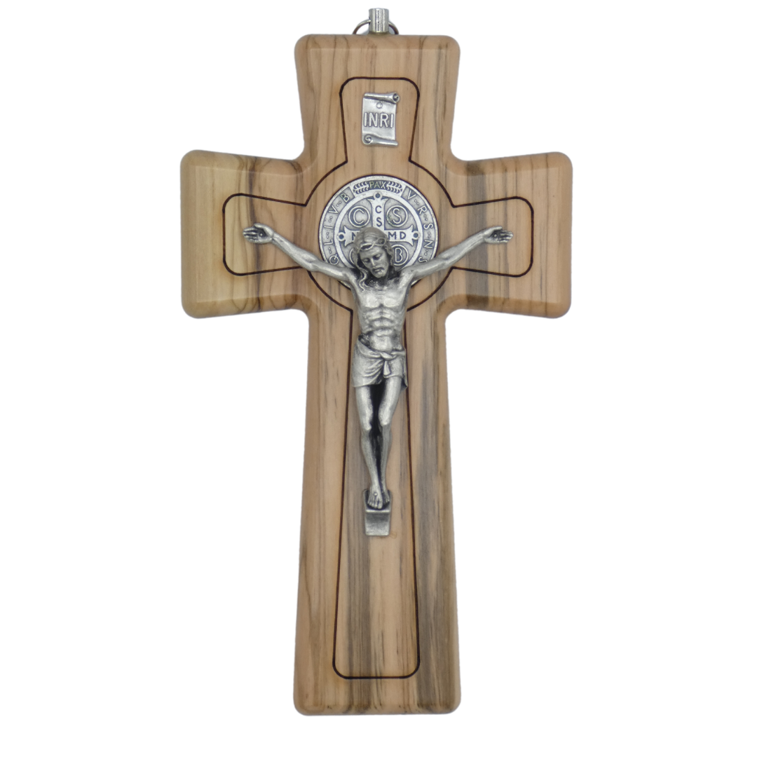 A genuine olive wood cross with broad crossbeams and an etched cross on the surface of the wood to accent its shape. A silver St. Benedict medal is set in the crucifix where the crossbeams meet. A powerful sacramental of the Church, the St. Benedict crucifix, when exorcized and blessed, brings a particular protection of the home where it is placed against evil as well as a particular presence of Christ himself. This modestly sized crucifix is perfect to bring Christ's presence to small places or to hang over a bed. This crucifix is purchased for our shop by our sisters who live and serve in the Heart of the Church in Rome.