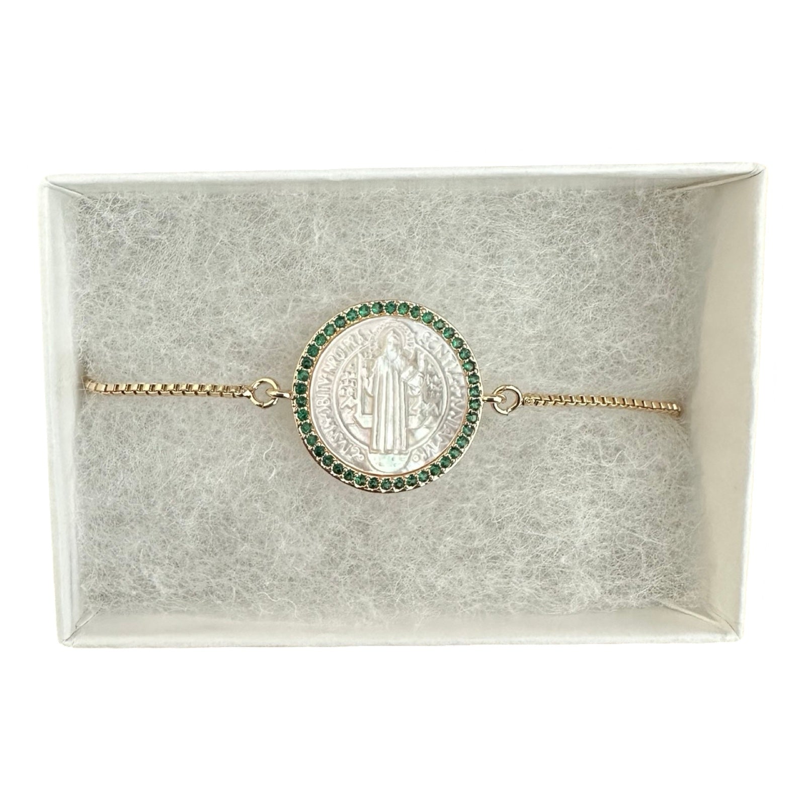This bracelet has a mother of pearl center with an image of St. Benedict surrounded by a green and gold border and with adjustable gold band. It is a very elegant way to wear your Saint Benedict medal for protection. With a sliding adjustable band, it will fit most wrists.