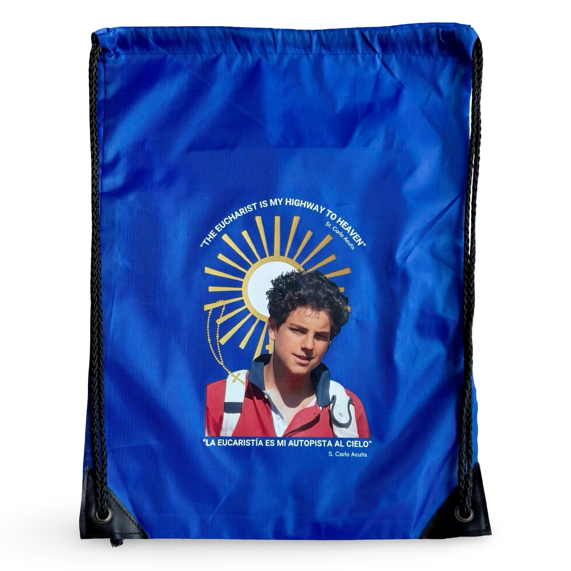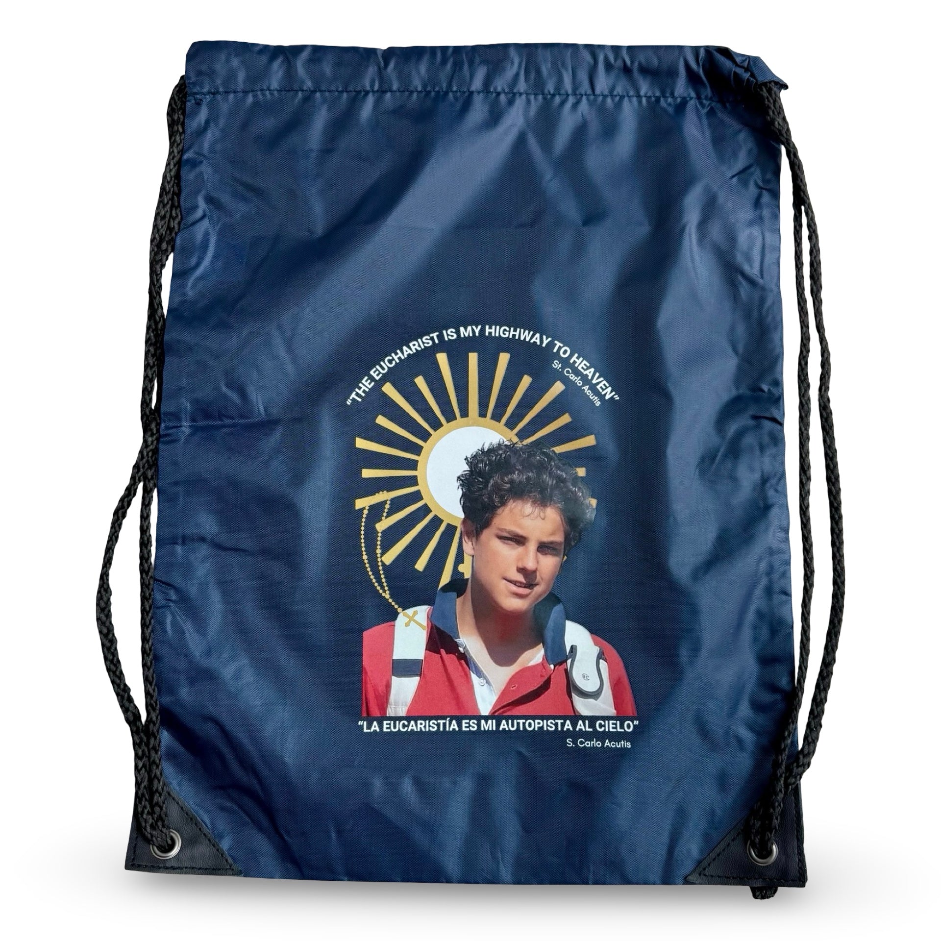 These drawstring bags have a bold and colorful image of St. Carlo Acutis with a Eucharistic monstrance behind him and a rosary - depicting his two great loves. It also has the following quote of Carlo in English and Spanish: