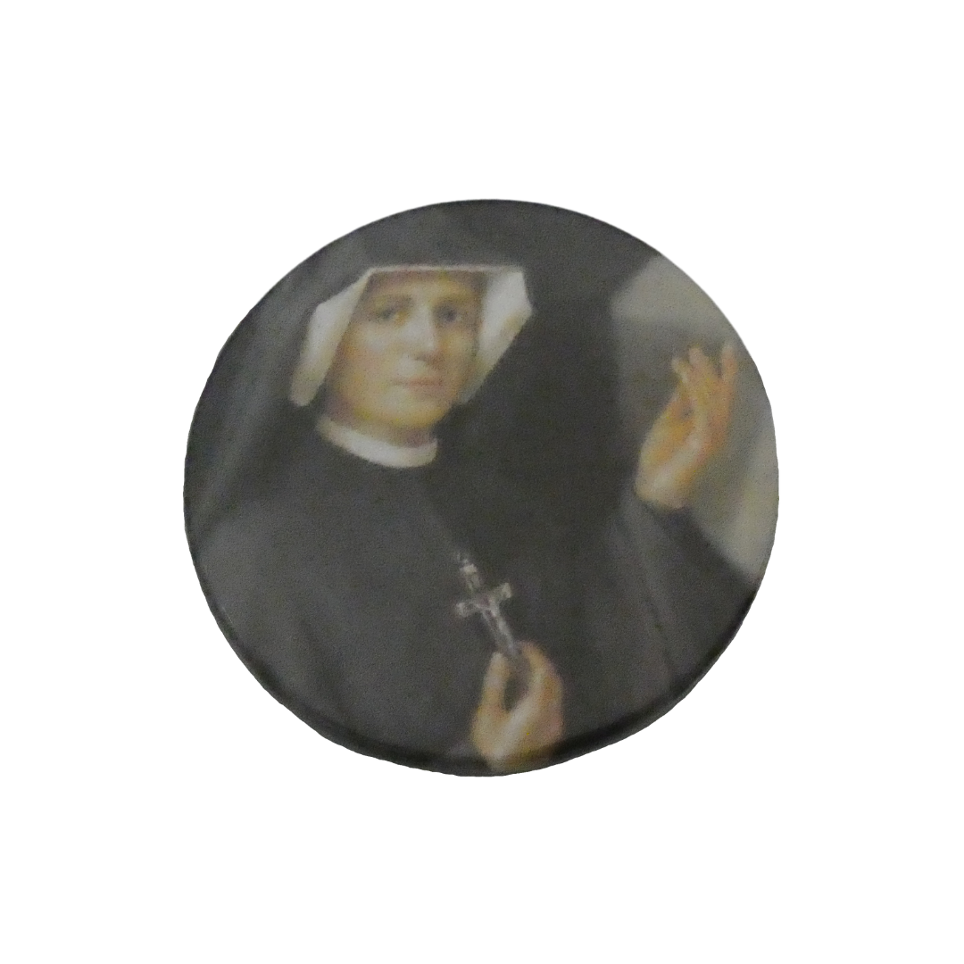 A beautiful pin button of St. Faustina. This item places perfectly on backpacks, jackets, and tote bags to evangelize as you go about everyday travels!