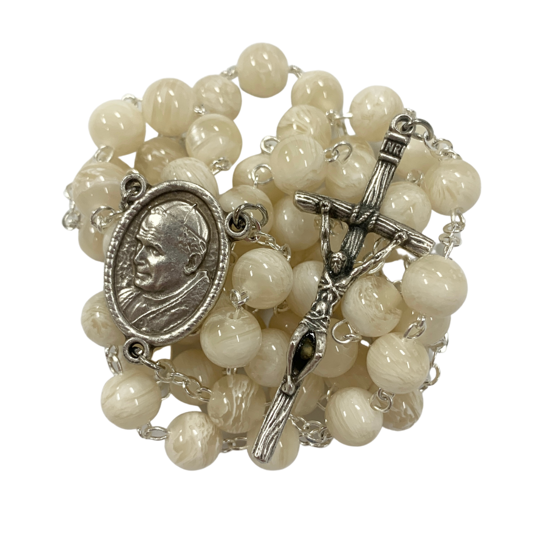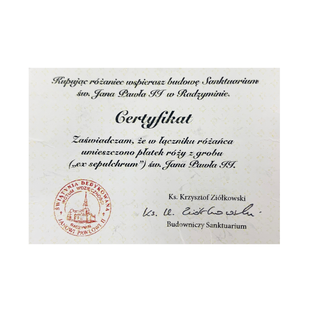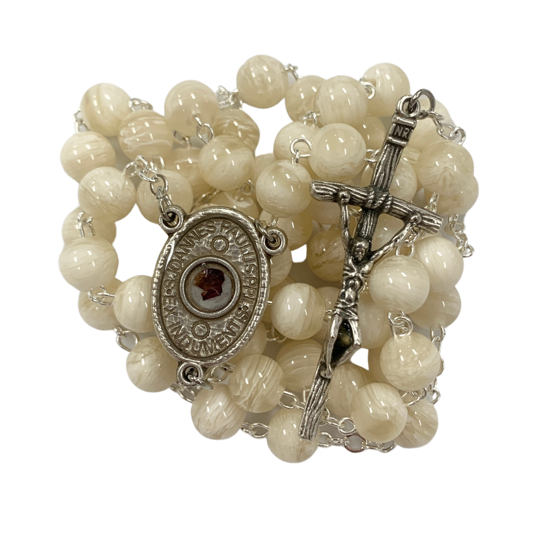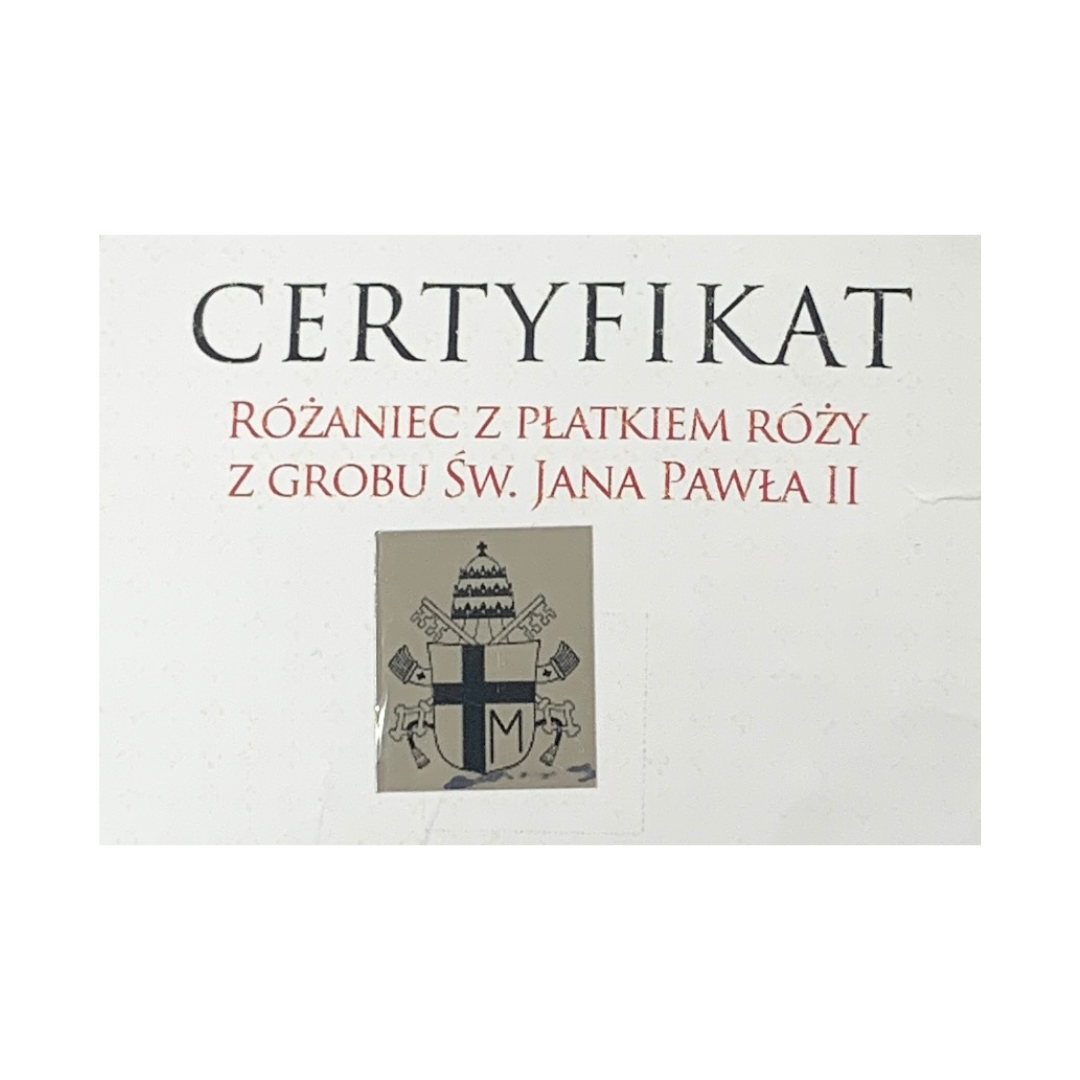 This beautiful rosary was imported from John Paul's homeland. It is a perfect gift for Priests, Religious, fathers, and the youth. It also includes a pouch with John Paul's Papal Crest. The relic is a rose petal touched to the body of St. John Paul II.