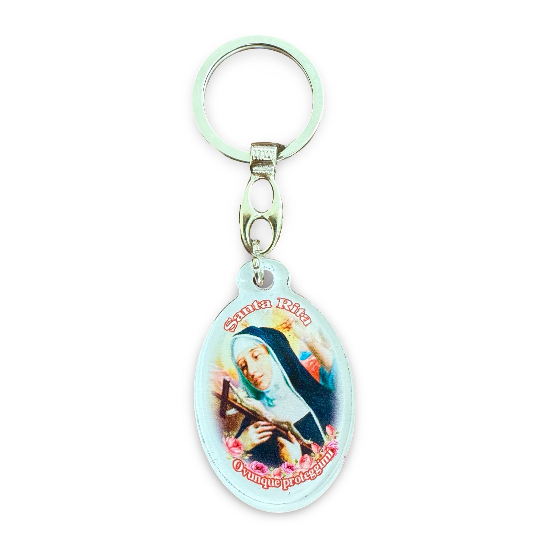 This large keychain of St. Rita contains a colored image of her as a Religious Sister contemplating the crucifix and surrounded by roses. It is perfect to add to your car keys, backpack, or bag.