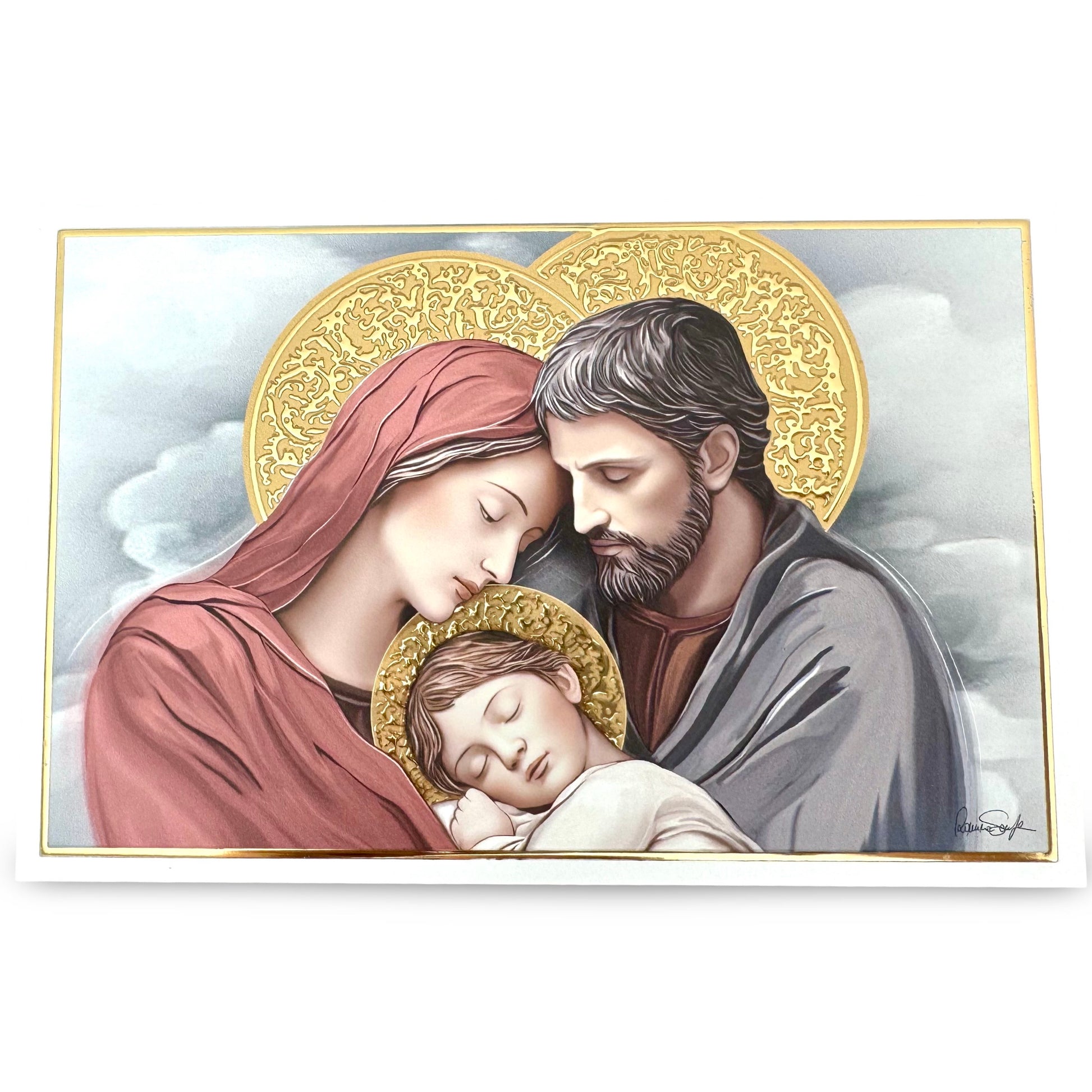 This beautiful, colored image of the Holy Family with gold accents will make a stunning addition to your desk, bookshelf, or home decor. It can hang or stand.