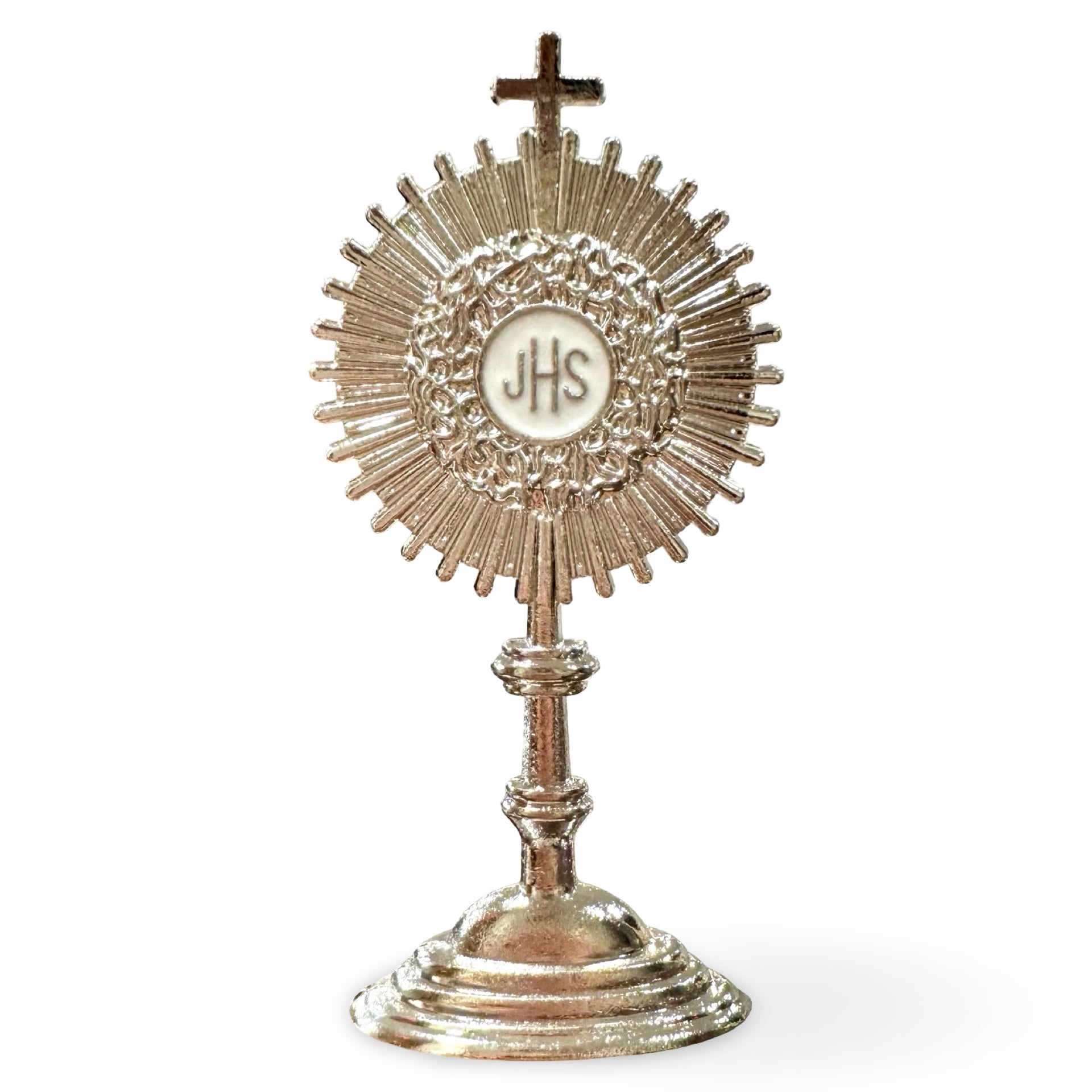 This is beautiful Eucharistic monstrance decoration reminds us of our Lord's presence with us in the Eucharist. They come in gold and silver and have a sticker bottom so that you can place them anywhere, including the car dashboard. May our hearts be burning with love for Him!