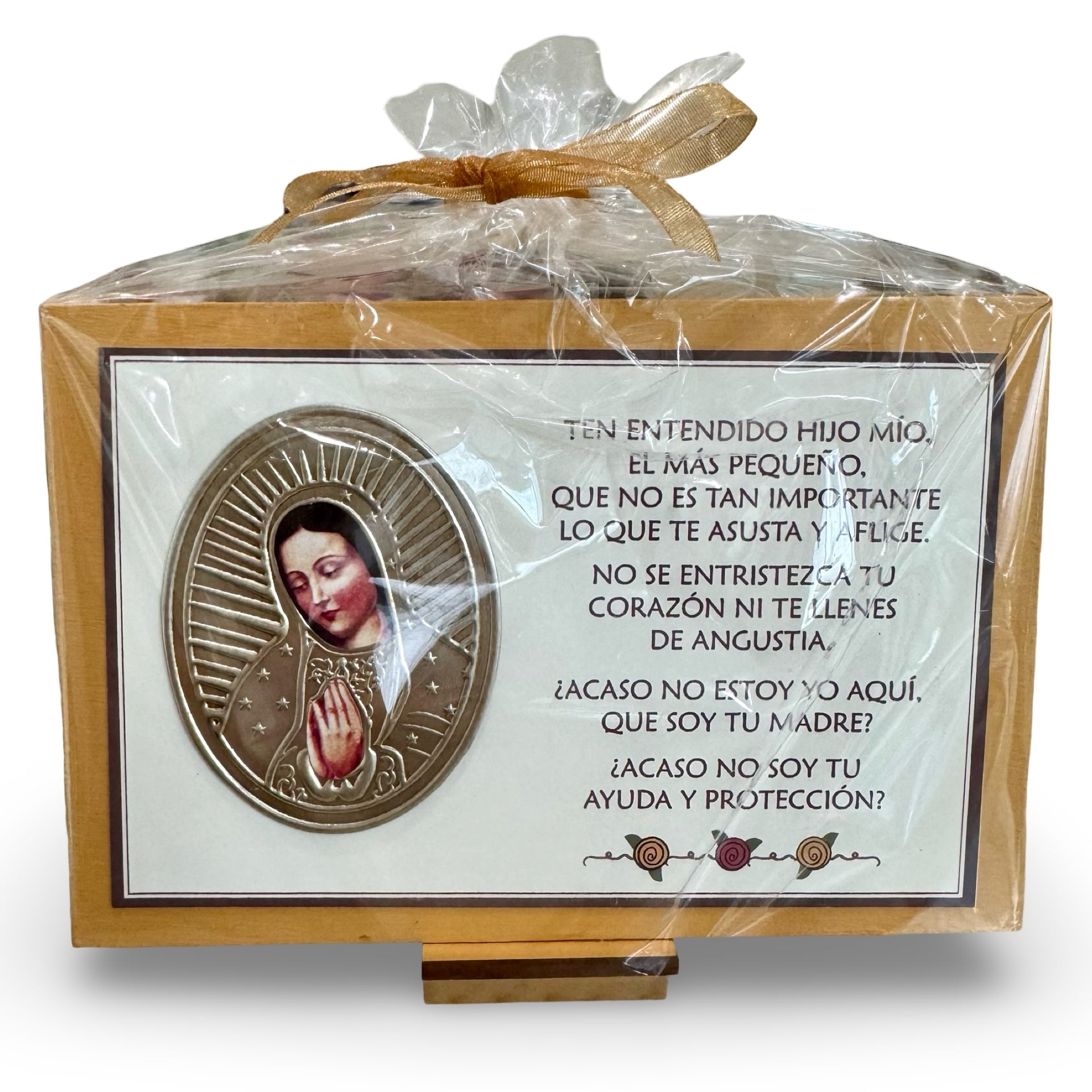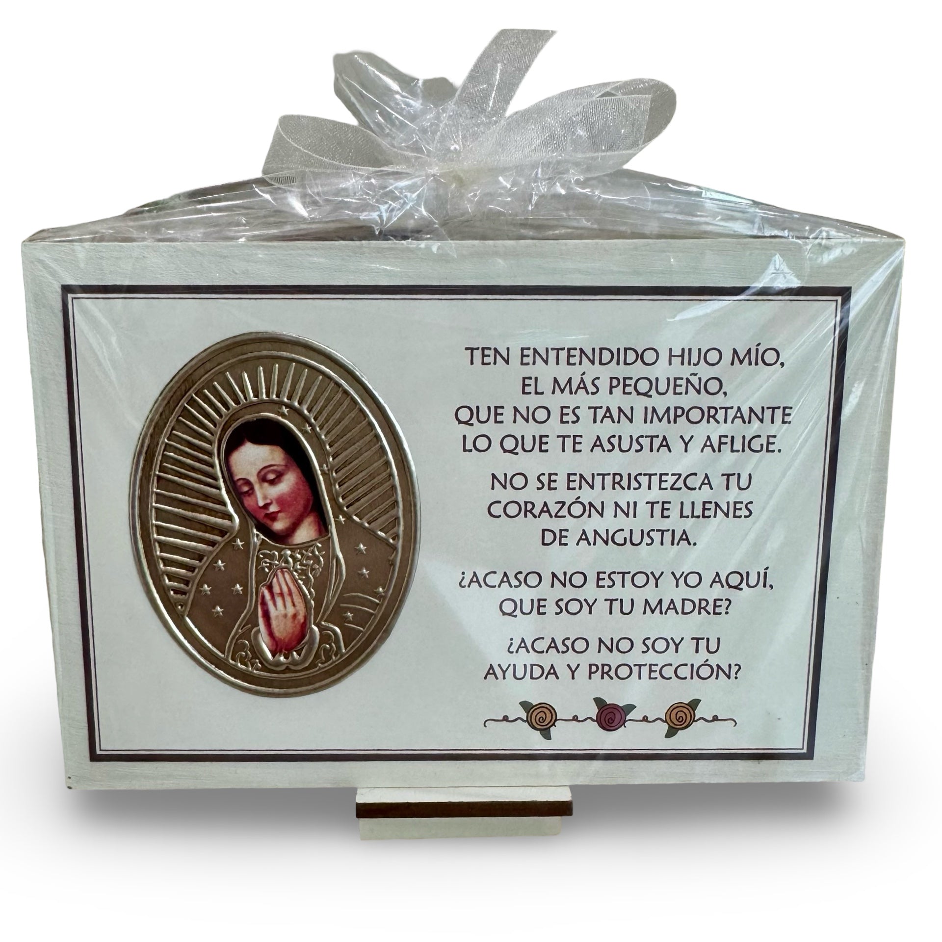 These colorful, standing plaques of Our Lady of Guadalupe were brought from the Basilica of Our Lady of Guadalupe. Wrapped in plastic and bow, they would make a wonderful present to any person devoted to Our Lady of Guadalupe.