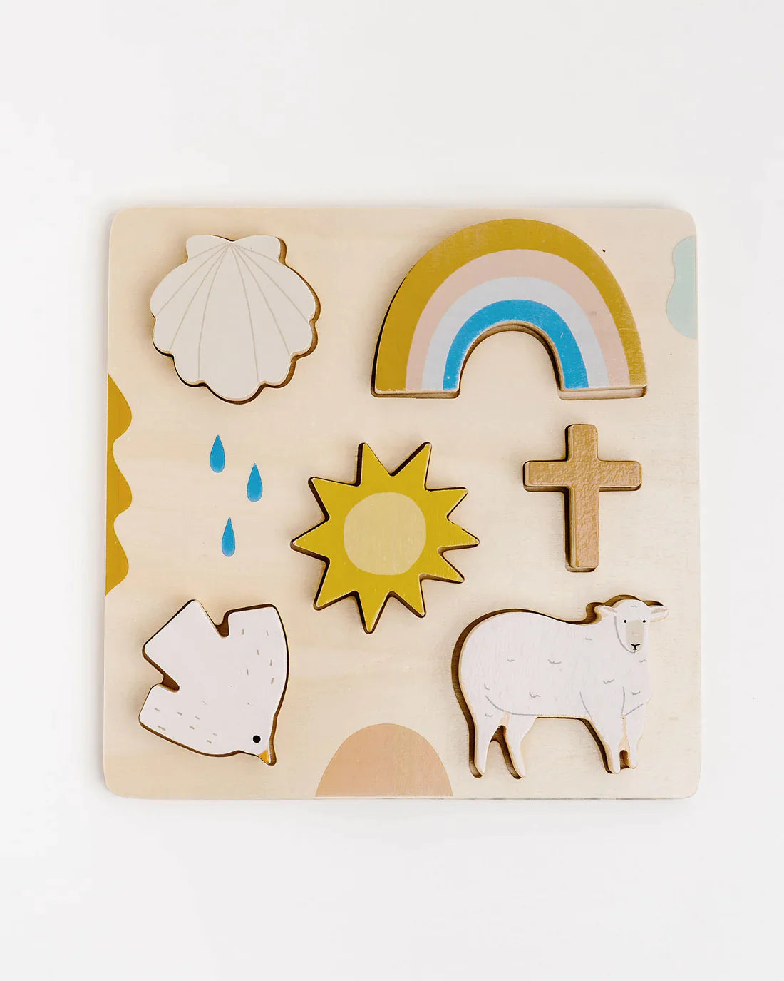 The puzzles make great baptism gifts and birthday gifts. The Trinity, which includes a sea shell, a rainbow, the sun, a cross, a dove, and a lamb. The puzzle is recommended for ages 12+ months.