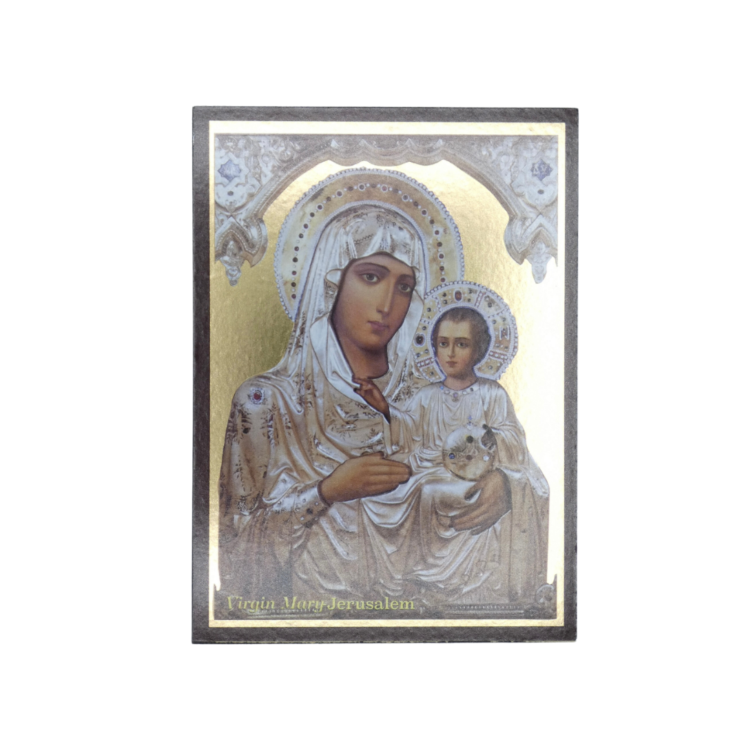 This icon of Our Lady of Jerusalem shows Our Lady and the child Jesus dressed in silver and is set on a gold background. This icon was handmade in Bethlehem. Iconography has been present in the Church since the 1st century when St. Luke drew an icon of Our Lady. Iconography communicates the spiritual to the viewer and allows us to understand the order and beauty of the Divine. The original icon of Our Lady of Jerusalem can be found in the Sepulcher of the Mother of God in Gethsemane. This icon can be hung on a wall and is perfect for a smaller room or office.