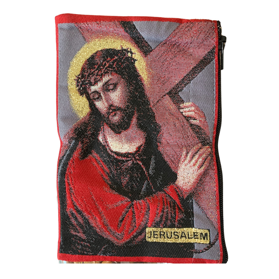 This Sacred Heart of Jesus pouch is perfect for holding prayer cards, rosaries, and other small devotional items. It fits well in a purse or can be used as a small handheld wallet. It bears the image of Our Lord with His Sacred Heart on a gold background.