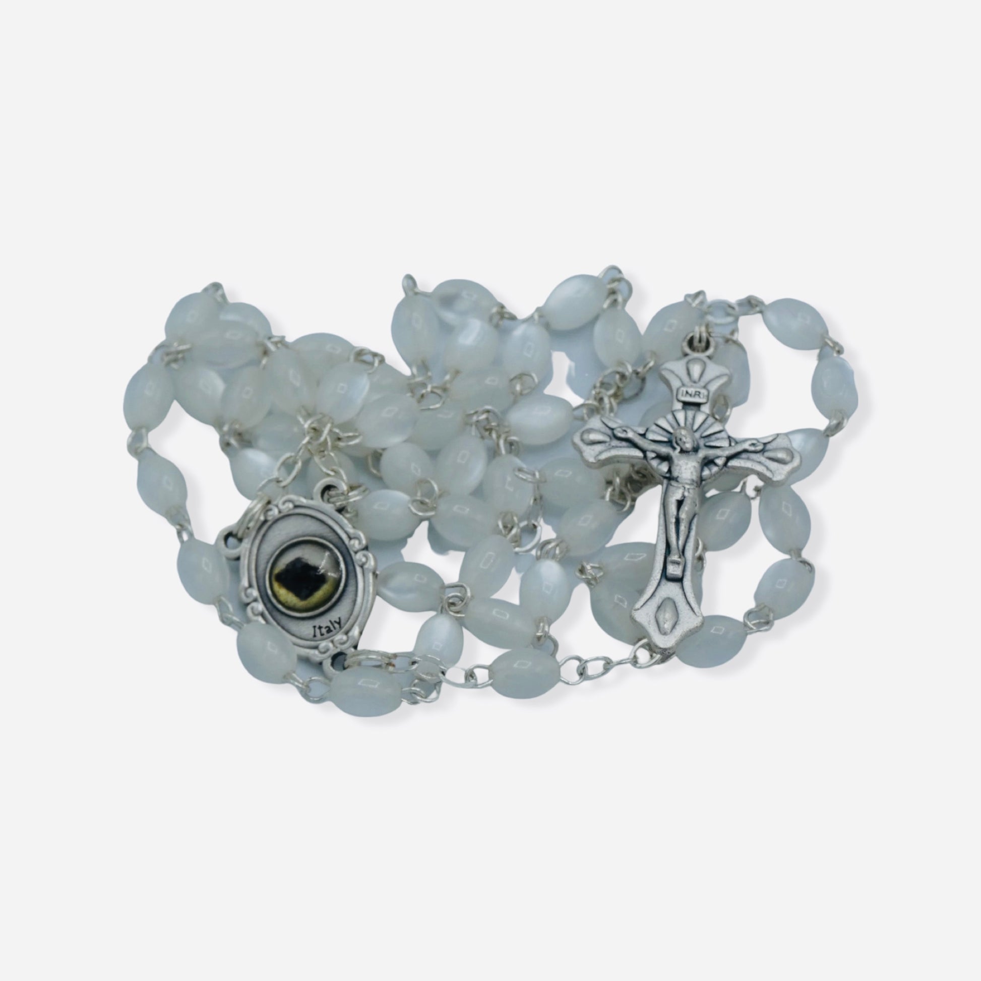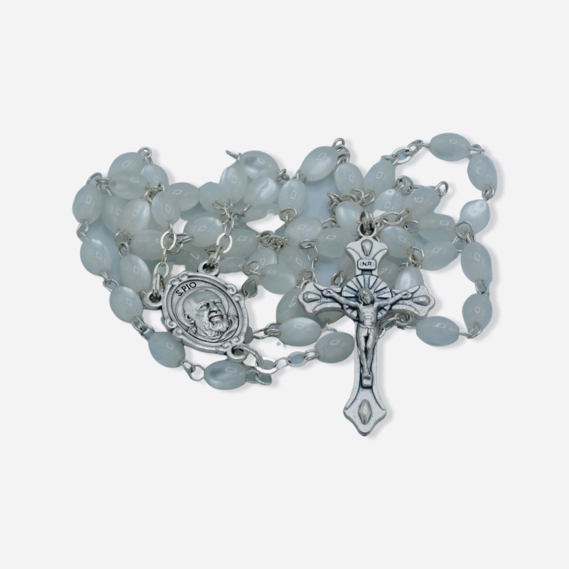 This rosary comes all the way from San Giovanni Rotondo and is made of white beads with metal links. The Our Father bead is a silver medal of St. Padre Pio with a second-class relic. This rosary comes with a metal crucifix with embellished points and unites the spiritual power of Our Lady and St. Padre Pio and is a perfect gift for any Padre Pio fans you know or as a personal rosary! This product is brought with love by our Sisters serving the Heart of the Church in Rome, Italy!