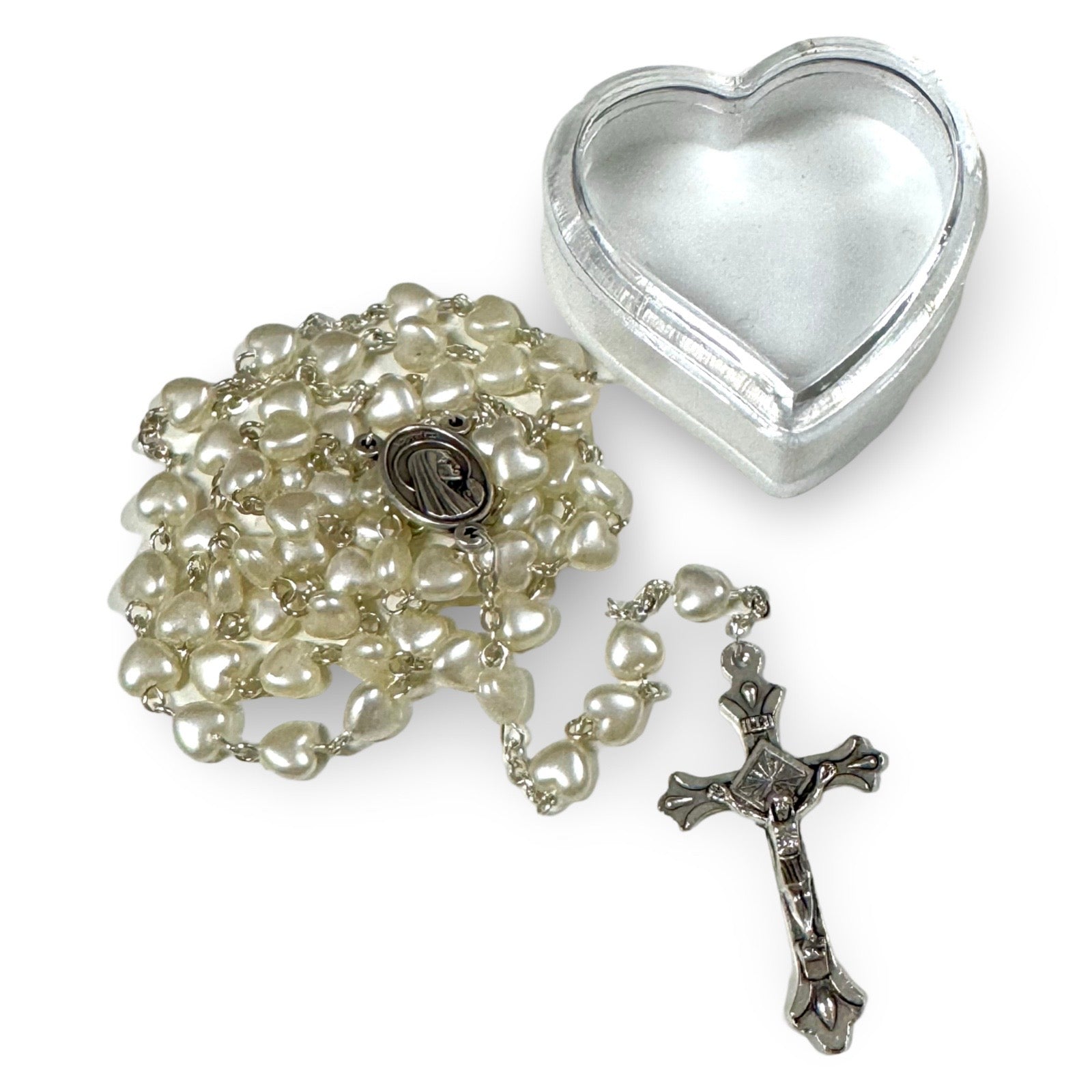White Pearl Lourdes Rosary with Heart-Shaped Beads in Heart Shaped Case
