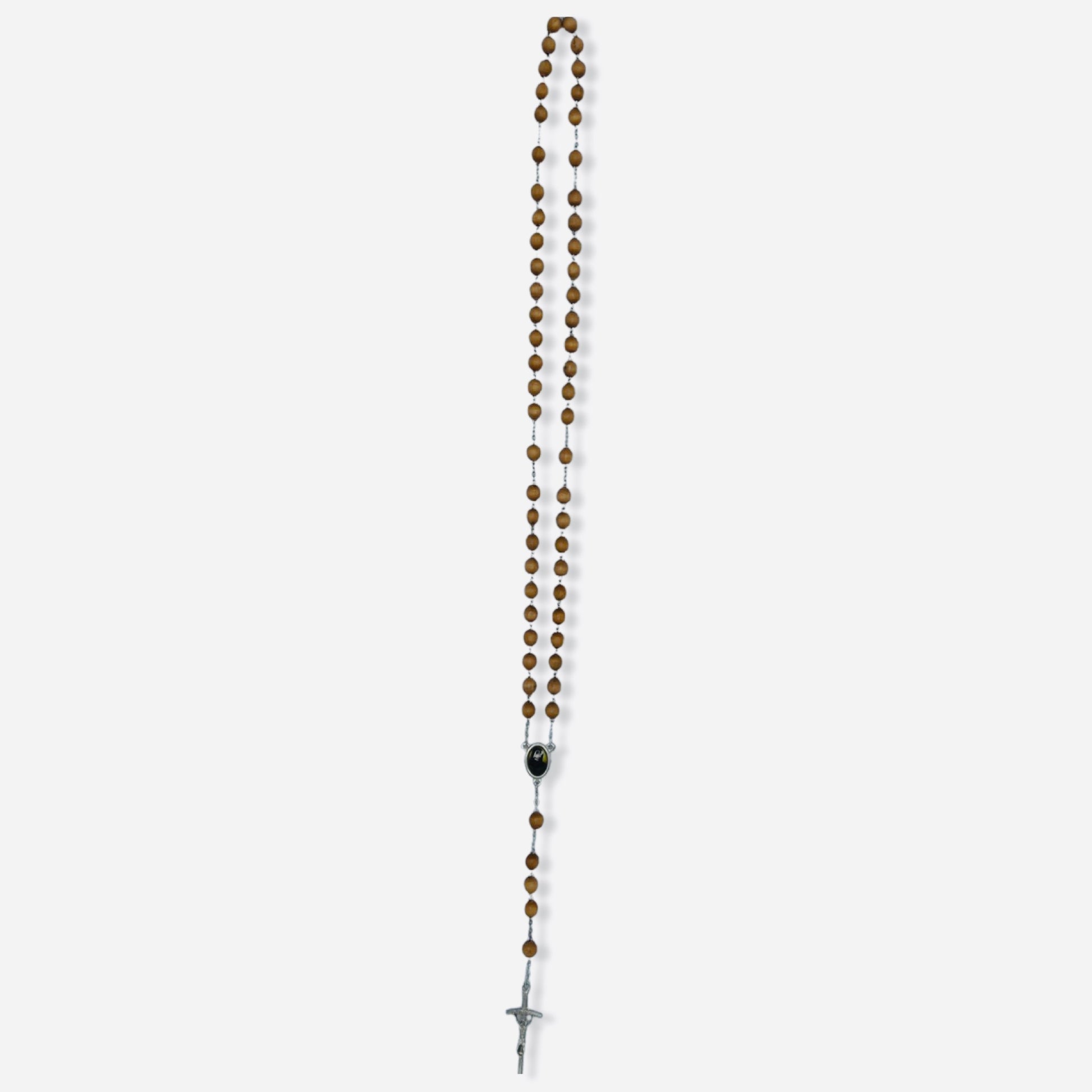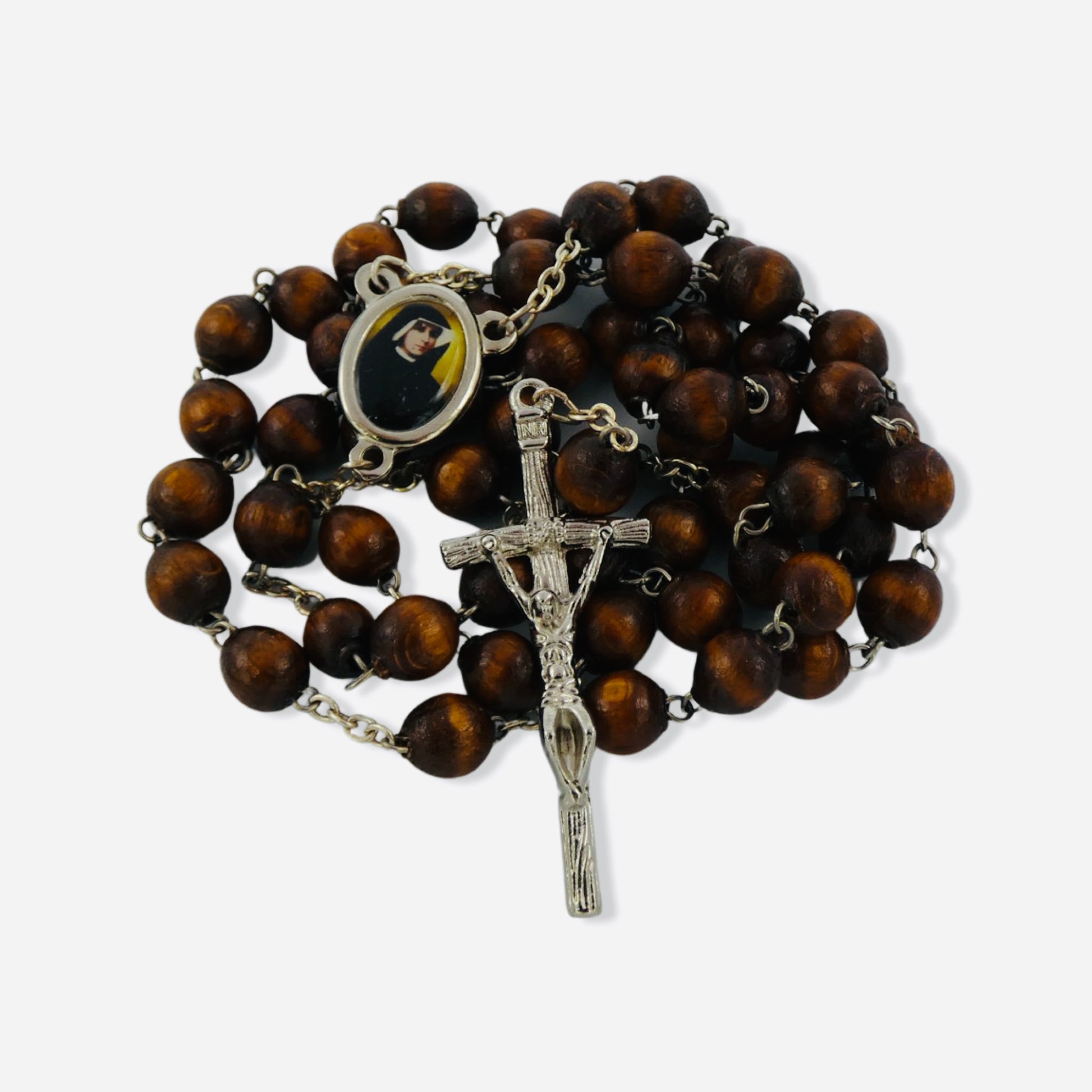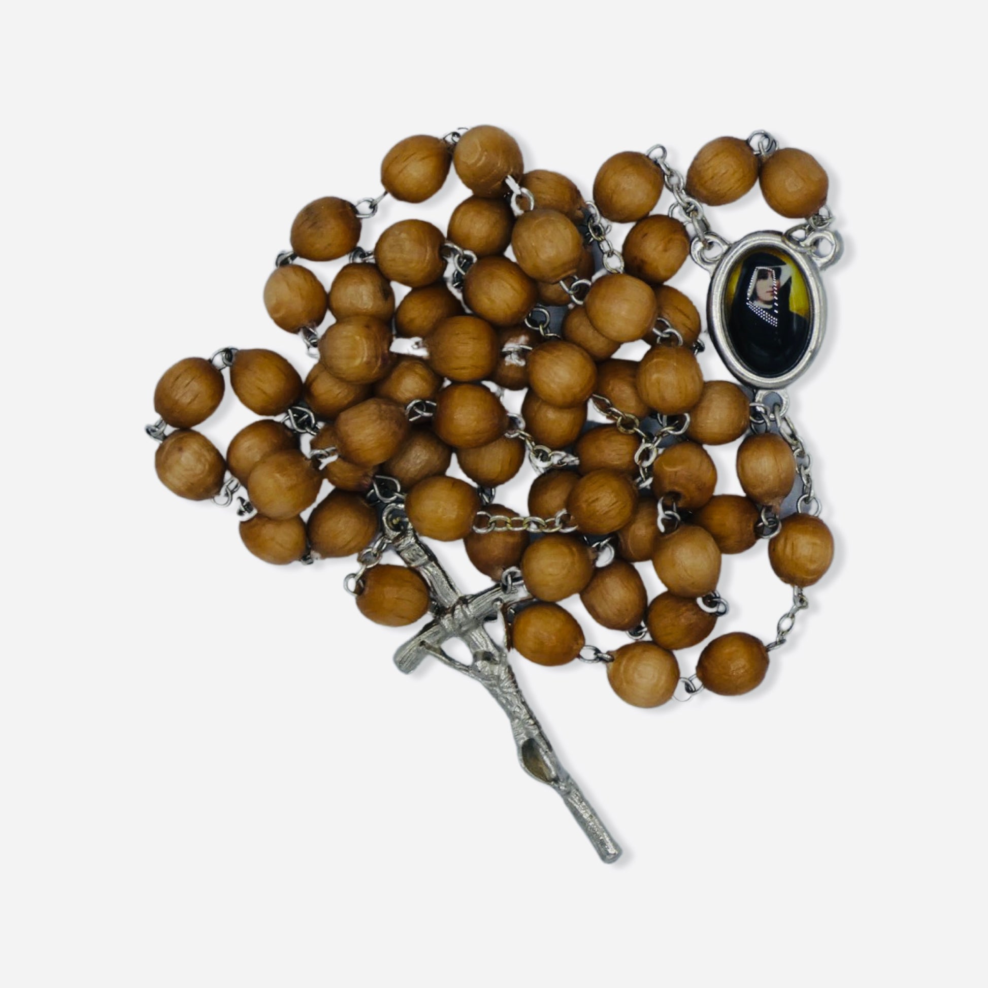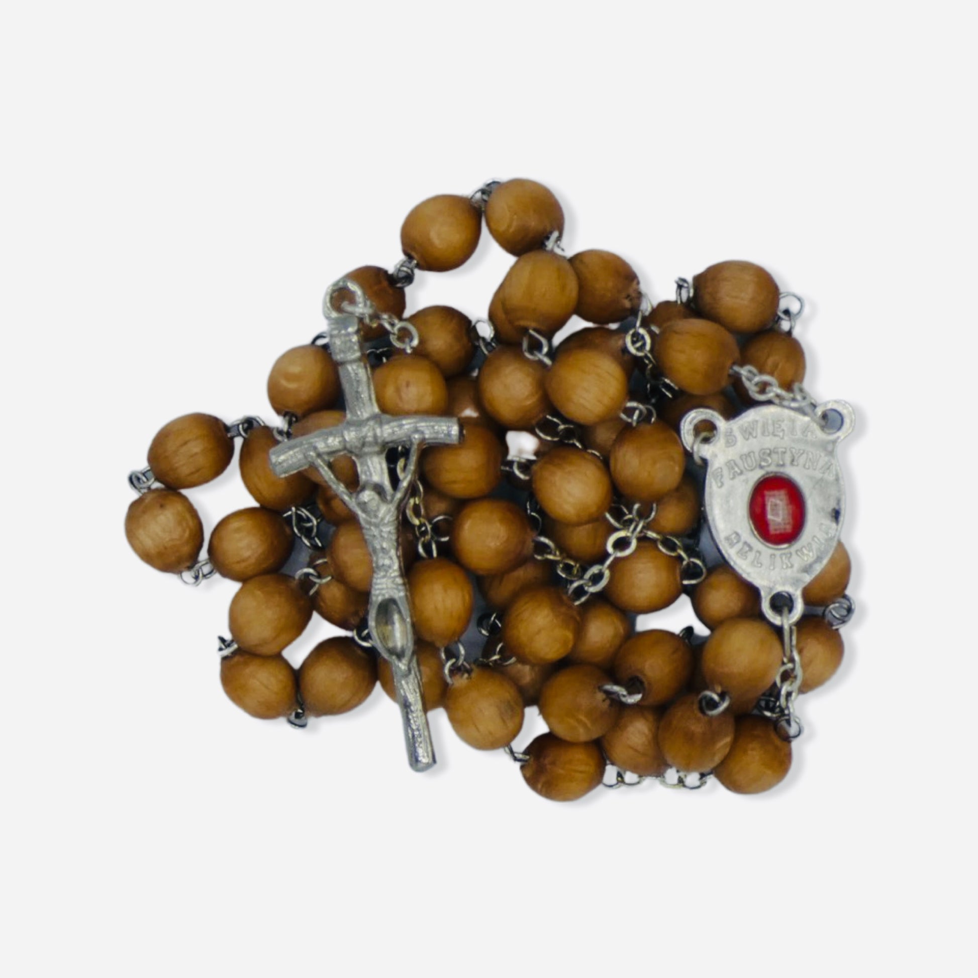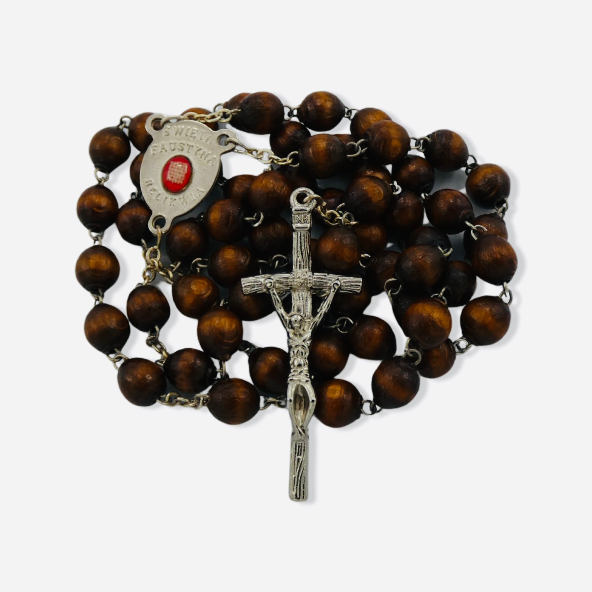 A wooden rosary which bears the cross of St. John Paul II and is joined together by an image and relic of St. Faustina Kowalska. This rosary is perfect to carry with you to recite the chaplet of Divine Mercy. A great gift for First Reconciliation or anyone in need of God's abounding mercy. Included with this item is a Divine Mercy Novena and Chaplet in English or Spanish.