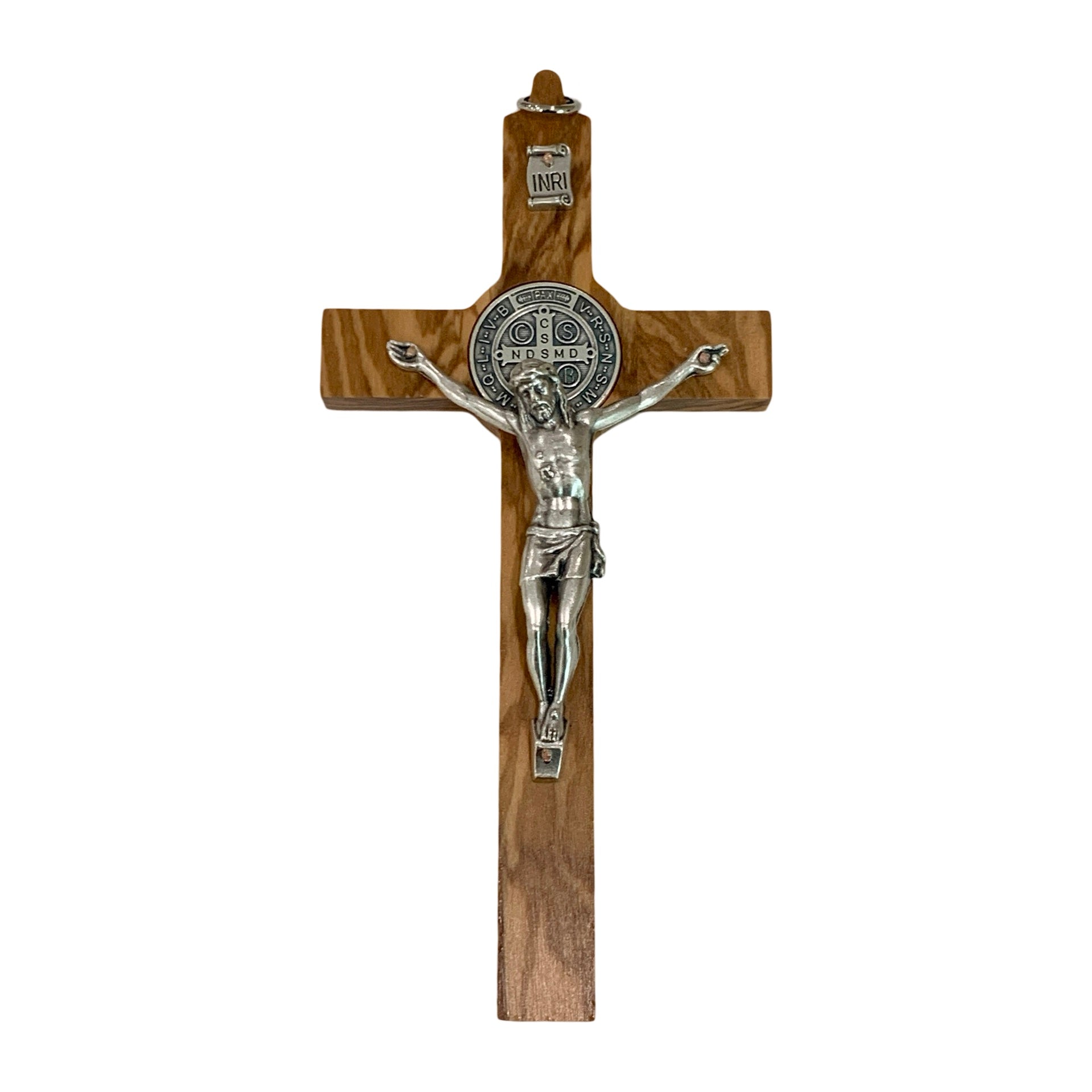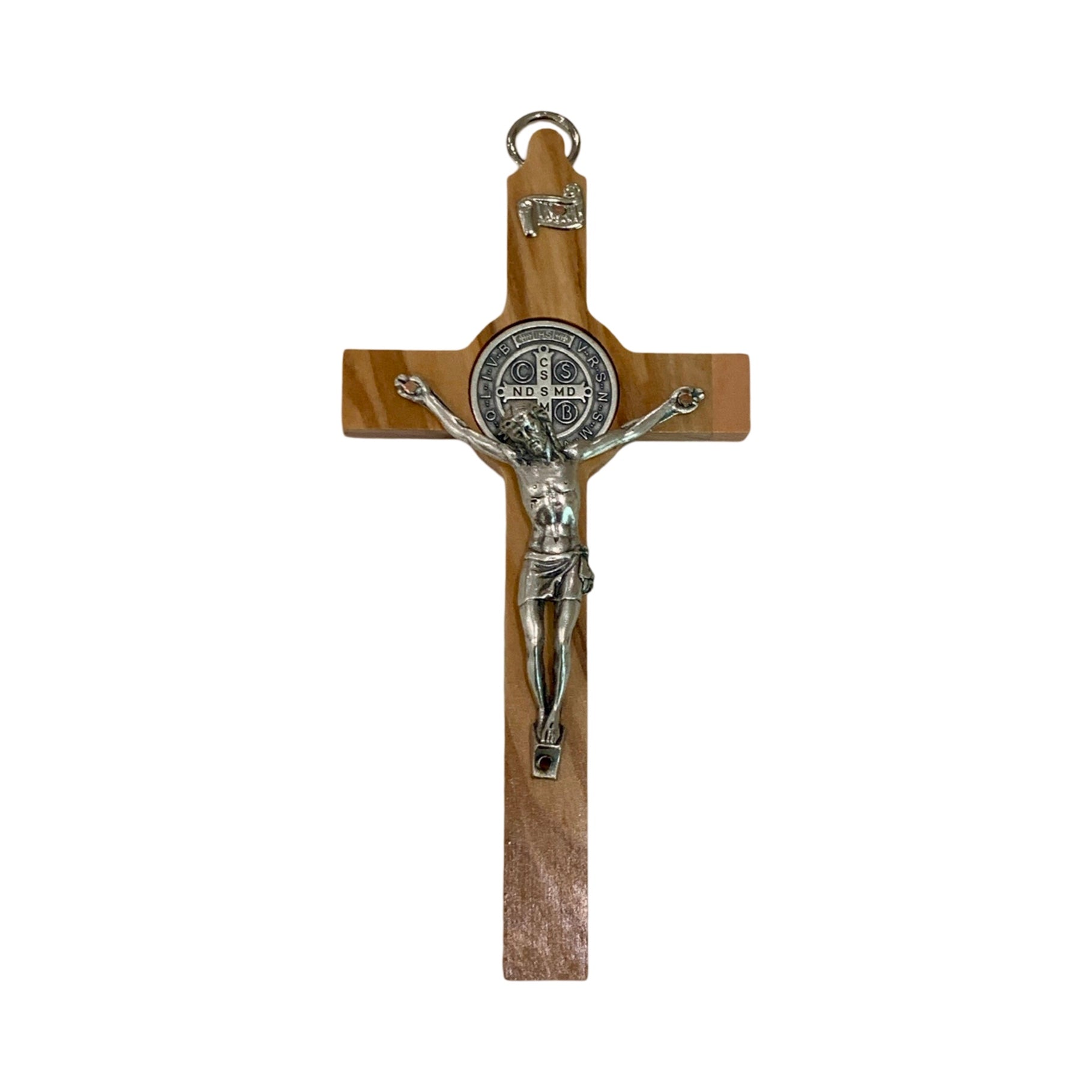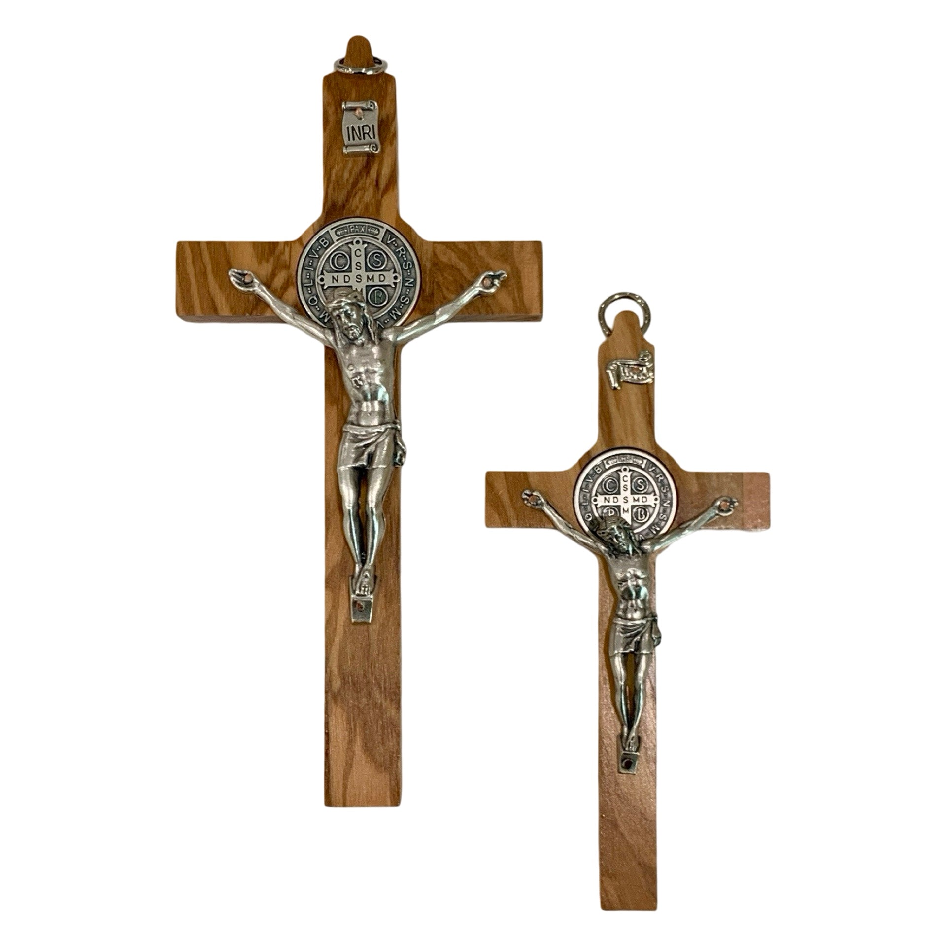 These crucifixes were brought from Italy. With a wooden cross and large silver medal of St. Benedict, they are the perfect size to put above your doors for protection.