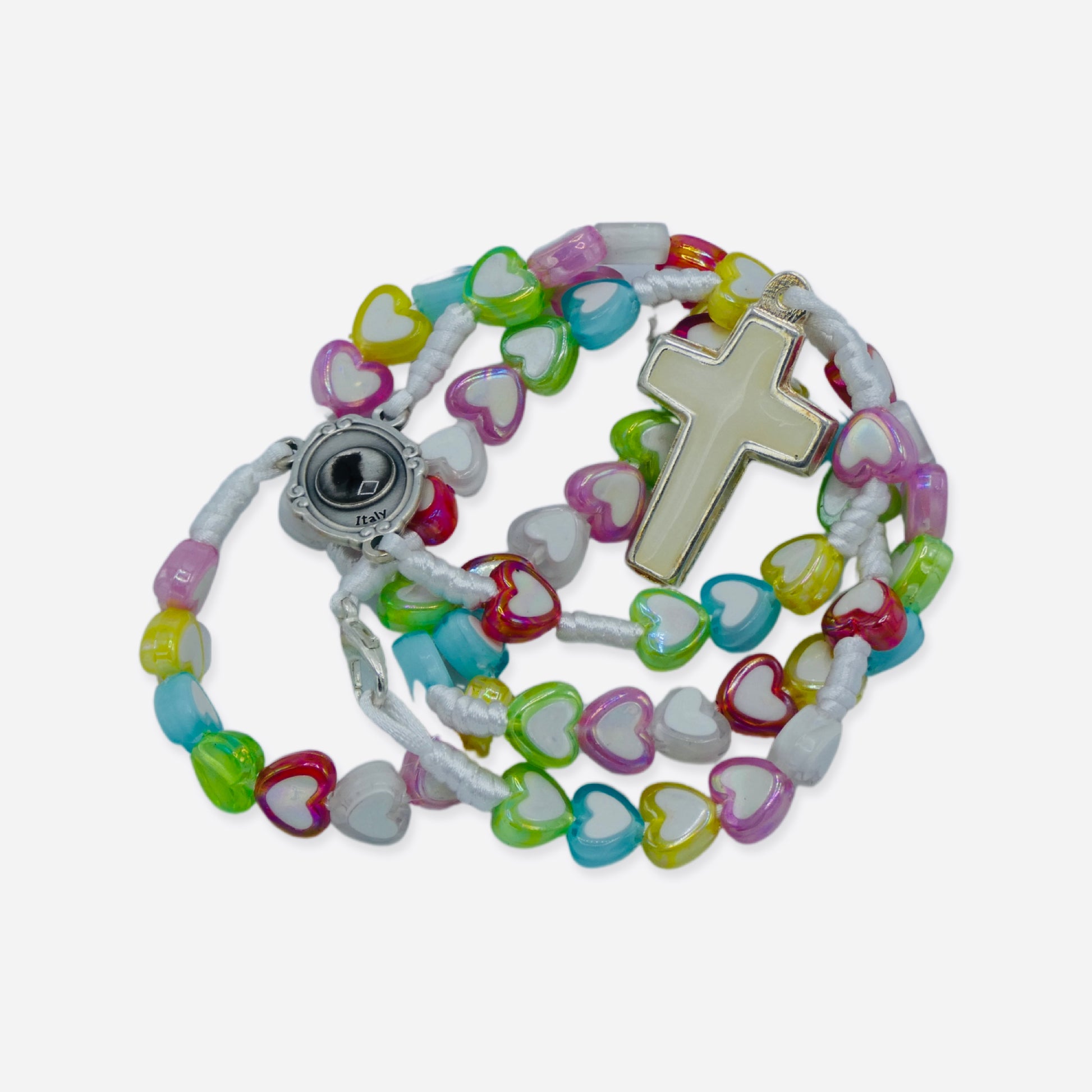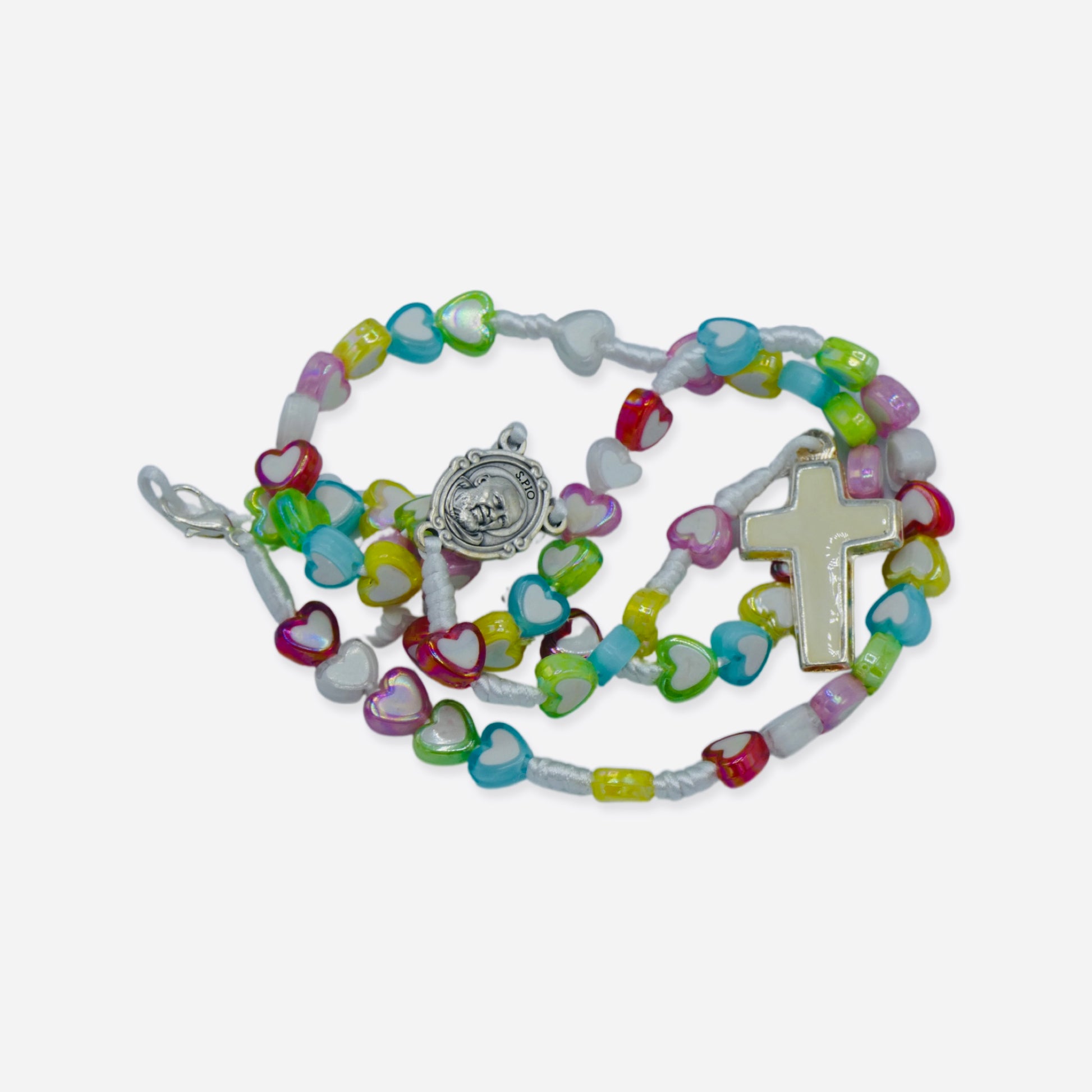 This rosary comes all the way from San Giovanni Rotondo and is ideal for any child making their First Communion or wanting to grow in their love for Our Lady or St. Padre Pio. The beads are a variety of colored hearts on white cord and have a simple white cross at the end. This rosary also features a silver medal of St. Padre Pio with a second-class relic as the beginning Our Father bead. This product is brought with love by our Sisters serving the Heart of the Church in Rome, Italy!